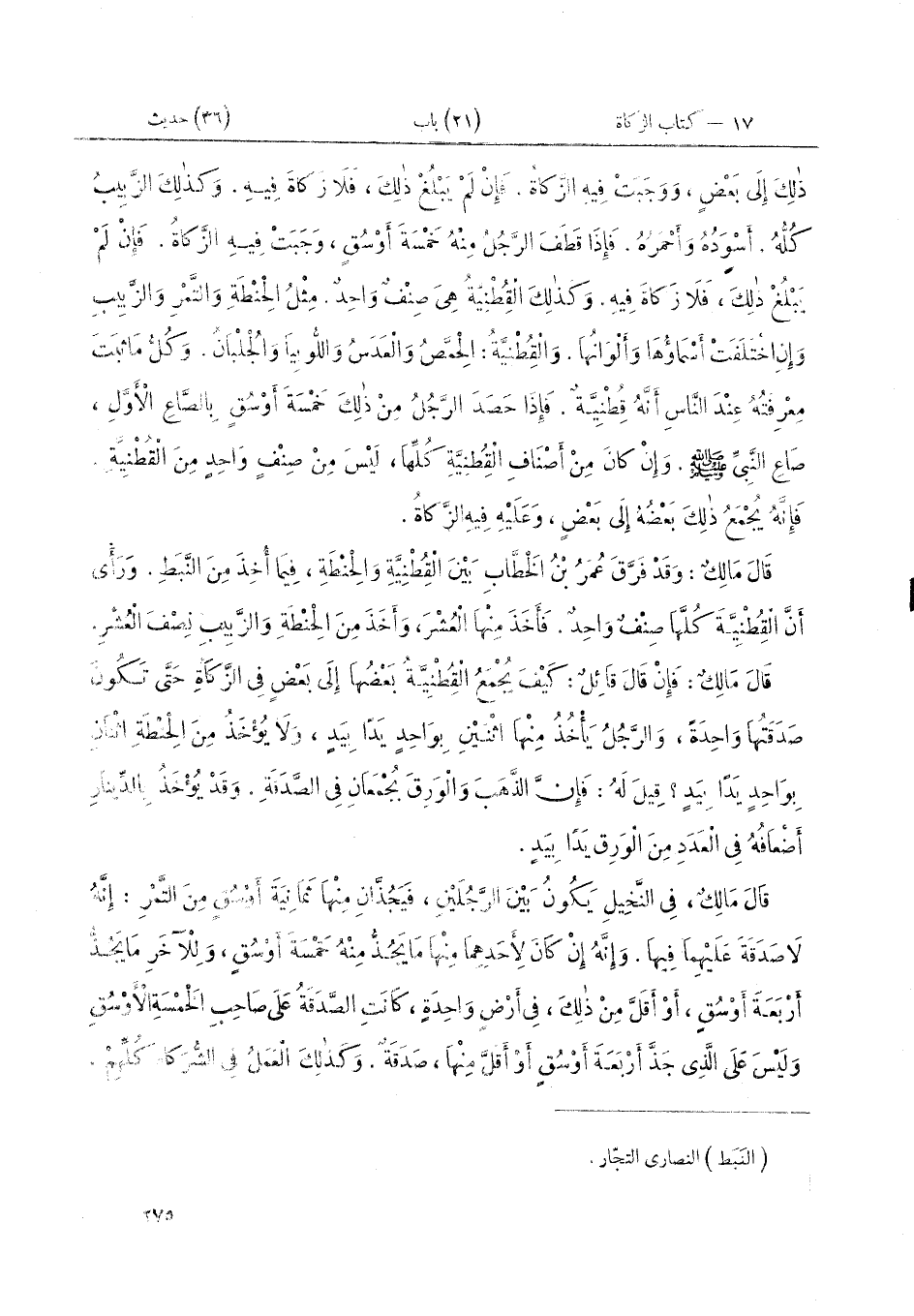 ذَلِكَ إِلَى بَعْضٍ، وَوَجَبَتْ فِيهِ الزَّكَاةُ. فَإِنْ لَمْ يَبْلُغْ ذَلِكَ فَلَا زَكَاةَ فِيهِ. وَكَذَلِكَ الزَّبِيبُ كُلُّهُ، أَسْوَدُهُ وَأَحْمَرُهُ، فَإِذَا قَطَفَ الرَّجُلُ مِنْهُ خَمْسَةَ أَوْسُقٍ وَجَبَتْ فِيهِ الزَّكَاةُ. فَإِنْ لَمْ يَبْلُغْ ذَلِكَ فَلَا زَكَاةَ فِيهِ. وَكَذَلِكَ الْقِطْنِيَّةُ هِيَ صِنْفٌ وَاحِدٌ. مِثْلُ الْحِنْطَةِ وَالتَّمْرِ وَالزَّبِيبِ وَإِنِ اخْتَلَفَتْ أَسْمَاؤُهَا وَأَلْوَانُهَا. وَالْقِطْنِيَّةُ: الْحِمَّصُ وَالْعَدَسُ وَاللُّوبِيَا وَالْجُلْبَانُ وَكُلُّ مَا ثَبَتَ مَعْرِفَتُهُ عِنْدَ النَّاسِ أَنَّهُ قِطْنِيَّةٌ. فَإِذَا حَصَدَ الرَّجُلُ مِنْ ذَلِكَ خَمْسَةَ أَوْسُقٍ بِالصَّاعِ الْأَوَّلِ، صَاعِ النَّبِيِّ صَلَّى اللهُ عَلَيْهِ وَسَلَّمَ. وَإِنْ كَانَ مِنْ أَصْنَافِ الْقِطْنِيَّةِ كُلِّهَا، لَيْسَ مِنْ صِنْفٍ وَاحِدٍ مِنَ الْقِطْنِيَّةِ فَإِنَّهُ يُجْمَعُ ذَلِكَ بَعْضُهُ إِلَى بَعْضٍ، وَعَلَيْهِ فِيهِ الزَّكَاةُ " قَالَ مَالِكٌ: «وَقَدْ فَرَّقَ عُمَرُ بْنُ الْخَطَّابِ بَيْنَ الْقِطْنِيَّةِ وَالْحِنْطَةِ فِيمَا أُخِذَ مِنَ النَّبَطِ. وَرَأَى أَنَّ الْقِطْنِيَّةَ كُلَّهَا صِنْفٌ وَاحِدٌ. فَأَخَذَ مِنْهَا الْعُشْرَ، وَأَخَذَ مِنَ الْحِنْطَةِ وَالزَّبِيبِ نِصْفَ الْعُشْرِ» قَالَ مَالِكٌ: " فَإِنْ قَالَ قَائِلٌ: كَيْفَ يُجْمَعُ الْقِطْنِيَّةُ بَعْضُهَا إِلَى بَعْضٍ فِي الزَّكَاةِ حَتَّى تَكُونَ صَدَقَتُهَا وَاحِدَةً، وَالرَّجُلُ يَأْخُذُ مِنْهَا اثْنَيْنِ بِوَاحِدٍ يَدًا بِيَدٍ، وَلَا يُؤْخَذُ مِنَ الْحِنْطَةِ اثْنَانِ بِوَاحِدٍ يَدًا بِيَدٍ؟ قِيلَ لَهُ: فَإِنَّ الذَّهَبَ وَالْوَرِقَ يُجْمَعَانِ فِي الصَّدَقَةِ. وَقَدْ يُؤْخَذُ بِالدِّينَارِ أَضْعَافُهُ فِي الْعَدَدِ مِنَ الْوَرِقِ يَدًا بِيَدٍ " قَالَ مَالِكٌ: " فِي النَّخِيلِ يَكُونُ بَيْنَ الرَّجُلَيْنِ فَيَجُذَّانِ مِنْهَا ثَمَانِيَةَ أَوْسُقٍ مِنَ التَّمْرِ: إِنَّهُ لَا صَدَقَةَ عَلَيْهِمَا فِيهَا. وَإِنَّهُ إِنْ كَانَ لِأَحَدِهِمَا مِنْهَا مَا يَجُذُّ مِنْهُ خَمْسَةَ أَوْسُقٍ، وَلِلْآخَرِ مَا يَجُذُّ أَرْبَعَةَ أَوْسُقٍ، أَوْ أَقَلَّ مِنْ ذَلِكَ فِي أَرْضٍ وَاحِدَةٍ، كَانَتِ الصَّدَقَةُ عَلَى صَاحِبِ الْخَمْسَةِ الْأَوْسُقِ وَلَيْسَ عَلَى الَّذِي جَذَّ أَرْبَعَةَ أَوْسُقٍ أَوْ أَقَلَّ مِنْهَا، صَدَقَةٌ. وَكَذَلِكَ الْعَمَلُ فِي الشُّرَكَاءِ كُلِّهِمْ. ⦗٢٧٦⦘ فِي كُلِّ زَرْعٍ مِنَ الْحُبُوبِ كُلِّهَا يُحْصَدُ، أَوِ النَّخْلُ يُجَدُّ أَوِ الْكَرْمُ يُقْطَفُ، فَإِنَّهُ إِذَا كَانَ كُلُّ رَجُلٍ مِنْهُمْ يَجُدُّ مِنَ التَّمْرِ، أَوْ يَقْطِفُ مِنَ الزَّبِيبِ، خَمْسَةَ أَوْسُقٍ. أَوْ يَحْصُدُ مِنَ الْحِنْطَةِ خَمْسَةَ أَوْسُقٍ. فَعَلَيْهِ فِيهِ الزَّكَاةُ، وَمَنْ كَانَ حَقُّهُ أَقَلَّ مِنْ خَمْسَةِ أَوْسُقٍ فَلَا صَدَقَةَ عَلَيْهِ. وَإِنَّمَا تَجِبُ الصَّدَقَةُ عَلَى مَنْ بَلَغَ جُدَادُهُ أَوْ قِطَافُهُ أَوْ حَصَادُهُ خَمْسَةَ أَوْسُقٍ " قَالَ مَالِكٌ: «السُّنَّةُ عِنْدَنَا، أَنَّ كُلَّ مَا أُخْرِجَتْ زَكَاتُهُ مِنْ هَذِهِ الْأَصْنَافِ كُلِّهَا، الْحِنْطَةِ وَالتَّمْرِ وَالزَّبِيبِ وَالْحُبُوبِ كُلِّهَا، ثُمَّ أَمْسَكَهُ صَاحِبُهُ بَعْدَ أَنْ أَدَّى صَدَقَتَهُ سِنِينَ. ثُمَّ بَاعَهُ، أَنَّهُ لَيْسَ عَلَيْهِ فِي ثَمَنِهِ زَكَاةٌ، حَتَّى يَحُولَ عَلَى ثَمَنِهِ الْحَوْلُ مِنْ يَوْمَ بَاعَهُ. إِذَا كَانَ أَصْلُ تِلْكَ الْأَصْنَافِ مِنْ فَائِدَةٍ أَوْ غَيْرِهَا. وَأَنَّهُ لَمْ يَكُنْ لِلتِّجَارَةِ. وَإِنَّمَا ذَلِكَ بِمَنْزِلَةِ الطَّعَامِ وَالْحُبُوبِ وَالْعُرُوضِ يُفِيدُهَا الرَّجُلُ ثُمَّ يُمْسِكُهَا سِنِينَ. ثُمَّ يَبِيعُهَا بِذَهَبٍ أَوْ وَرِقٍ، فَلَا يَكُونُ عَلَ