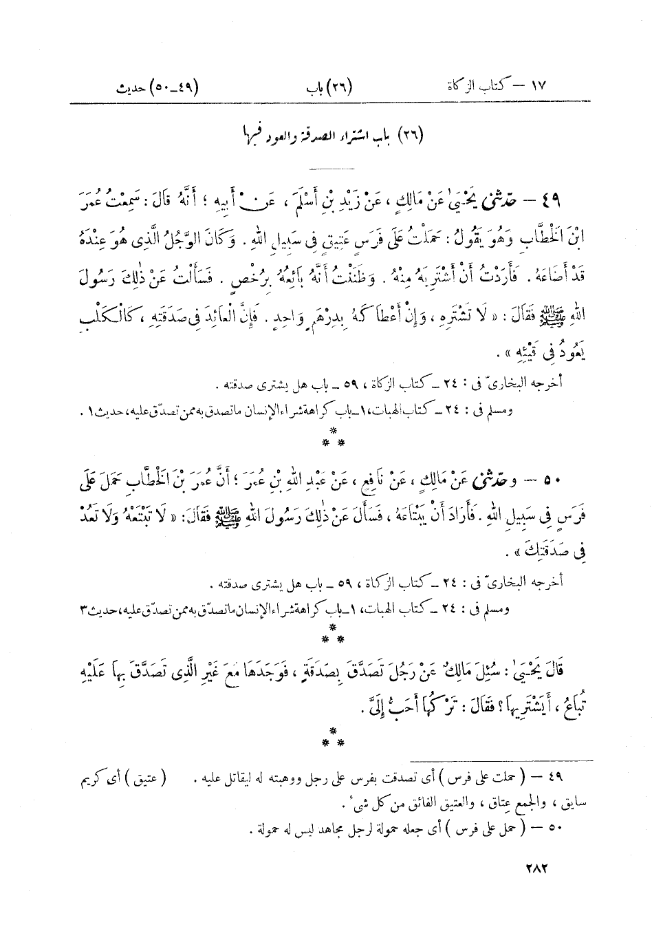 ٤٩ - حَدَّثَنِي يَحْيَى، عَنْ مَالِكٍ، عَنْ زَيْدِ بْنِ أَسْلَمَ، عَنْ أَبِيهِ، أَنَّهُ قَالَ: سَمِعْتُ عُمَرَ بْنَ الْخَطَّابِ وَهُوَ يَقُولُ: حَمَلْتُ عَلَى فَرَسٍ عَتِيقٍ فِي سَبِيلِ اللَّهِ، وَكَانَ الرَّجُلُ الَّذِي هُوَ عِنْدَهُ قَدْ أَضَاعَهُ. فَأَرَدْتُ أَنْ أَشْتَرِيَهُ مِنْهُ. وَظَنَنْتُ أَنَّهُ بَائِعُهُ بِرُخْصٍ. فَسَأَلْتُ عَنْ ذَلِكَ رَسُولَ اللَّهِ صَلَّى اللهُ عَلَيْهِ وَسَلَّمَ فَقَالَ: «لَا تَشْتَرِهِ وَإِنْ أَعْطَاكَهُ بِدِرْهَمٍ وَاحِدٍ. فَإِنَّ الْعَائِدَ فِي صَدَقَتِهِ، كَالْكَلْبِ يَعُودُ فِي قَيْئِهِ»