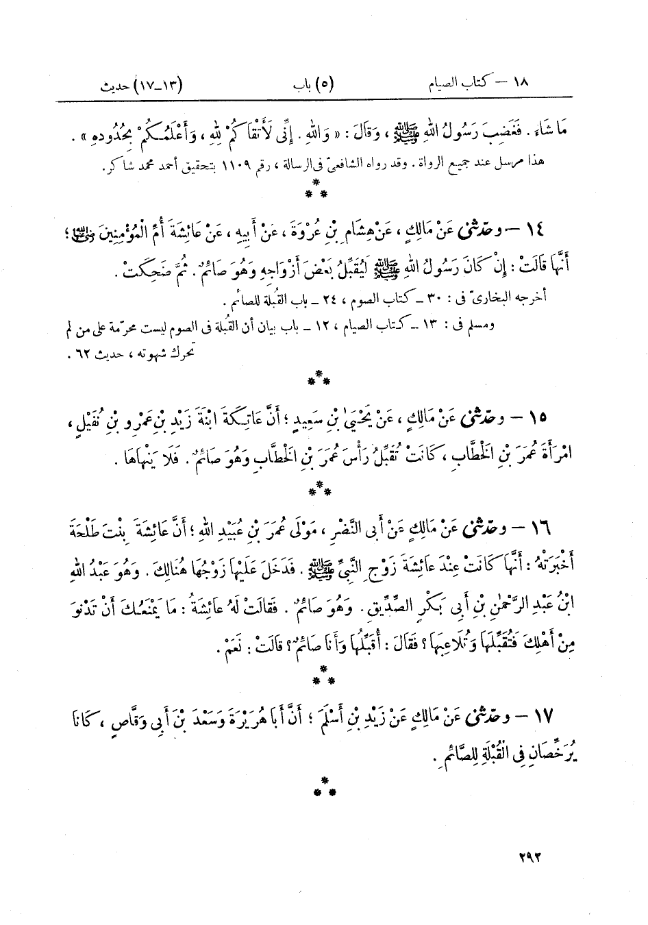 ١٤ - وَحَدَّثَنِي عَنْ مَالِكٍ، عَنْ هِشَامِ بْنِ عُرْوَةَ، عَنْ أَبِيهِ، عَنْ عَائِشَةَ أُمِّ الْمُؤْمِنِينَ رَضِيَ اللَّهُ عَنْهَا أَنَّهَا قَالَتْ: إِنْ كَانَ رَسُولُ اللَّهِ صَلَّى اللهُ عَلَيْهِ وَسَلَّمَ «لَيُقَبِّلُ بَعْضَ أَزْوَاجِهِ وَهُوَ صَائِمٌ». ثُمَّ ضَحِكَتْ