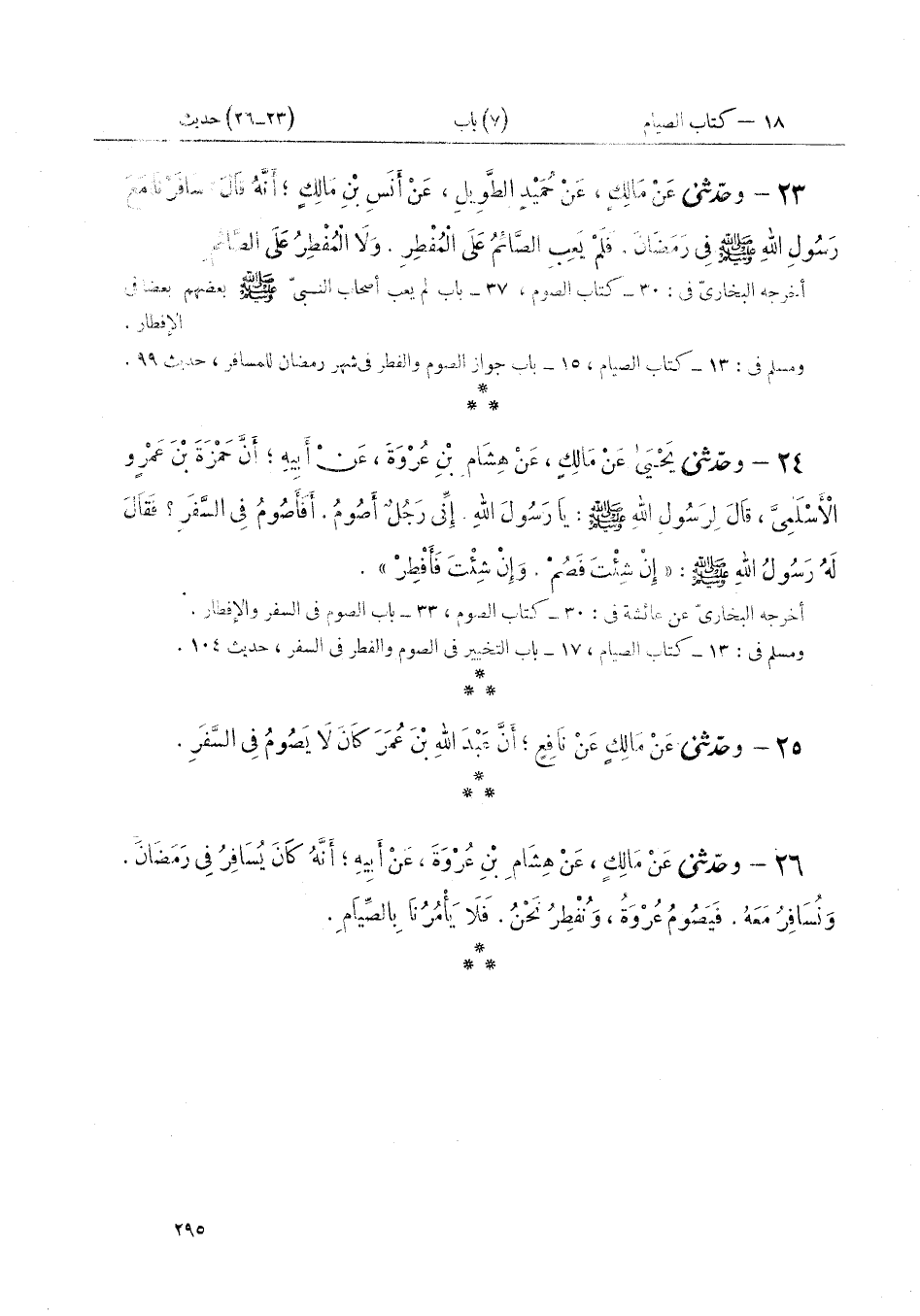 ٢٤ - وَحَدَّثَنِي يَحْيَى، عَنْ مَالِكٍ، عَنْ هِشَامِ بْنِ عُرْوَةَ، عَنْ أَبِيهِ، أَنَّ حَمْزَةَ بْنَ عَمْرٍو الْأَسْلَمِيَّ قَالَ لِرَسُولِ اللَّهِ صَلَّى اللهُ عَلَيْهِ وَسَلَّمَ: يَا رَسُولَ اللَّهِ. إِنِّي رَجُلٌ أَصُومُ. أَفَأَصُومُ فِي السَّفَرِ؟ فَقَالَ لَهُ رَسُولُ اللَّهِ صَلَّى اللهُ عَلَيْهِ وَسَلَّمَ: «إِنْ شِئْتَ فَصُمْ. وَإِنْ شِئْتَ فَأَفْطِرْ»