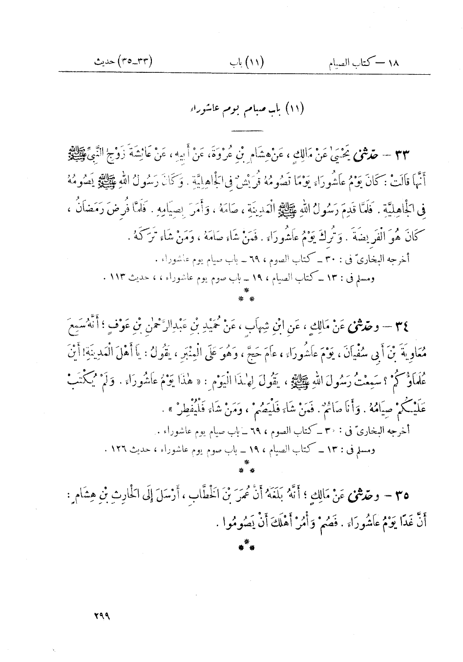 ٣٥ - وَحَدَّثَنِي عَنْ مَالِكٍ أَنَّهُ بَلَغَهُ أَنَّ عُمَرَ بْنَ الْخَطَّابِ أَرْسَلَ إِلَى الْحَارِثِ بْنِ هِشَامٍ: «أَنَّ غَدًا يَوْمُ عَاشُورَاءَ فَصُمْ، وَأْمُرْ أَهْلَكَ أَنْ يَصُومُوا»