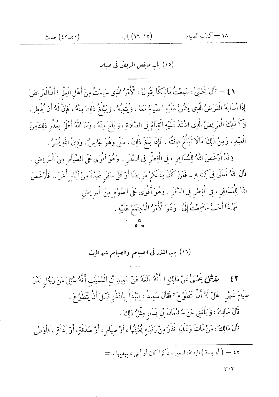٤١ - قَالَ يَحْيَى: سَمِعْتُ مَالِكًا يَقُولُ: " الْأَمْرُ الَّذِي سَمِعْتُ مِنْ أَهْلِ الْعِلْمِ، أَنَّ الْمَرِيضَ إِذَا أَصَابَهُ الْمَرَضُ الَّذِي يَشُقُّ عَلَيْهِ الصِّيَامُ مَعَهُ، وَيُتْعِبُهُ، وَيَبْلُغُ ذَلِكَ مِنْهُ، فَإِنَّ لَهُ أَنْ يُفْطِرَ. وَكَذَلِكَ الْمَرِيضُ الَّذِي اشْتَدَّ عَلَيْهِ الْقِيَامُ فِي الصَّلَاةِ، وَبَلَغَ مِنْهُ، وَمَا اللَّهُ أَعْلَمُ بِعُذْرِ ذَلِكَ مِنَ الْعَبْدِ، وَمِنْ ذَلِكَ مَا لَا تَبْلُغُ صِفَتُهُ، فَإِذَا بَلَغَ ذَلِكَ، صَلَّى وَهُوَ جَالِسٌ. وَدِينُ اللَّهِ يُسْرٌ. وَقَدْ أَرْخَصَ اللَّهُ لِلْمُسَافِرِ، فِي الْفِطْرِ فِي السَّفَرِ. وَهُوَ أَقْوَى عَلَى الصِّيَامِ مِنَ الْمَرِيضِ. قَالَ اللَّهُ تَعَالَى فِي كِتَابِهِ {فَمَنْ كَانَ مِنْكُمْ مَرِيضًا أَوْ عَلَى سَفَرٍ فَعِدَّةٌ مِنْ أَيَّامٍ أُخَرَ} [البقرة: ١٨٤] فَأَرْخَصَ اللَّهُ لِلْمُسَافِرِ، فِي الْفِطْرِ فِي السَّفَرِ. وَهُوَ أَقْوَى عَلَى الصَّوْمِ مِنَ الْمَرِيضِ. فَهَذَا أَحَبُّ مَا سَمِعْتُ إِلَيَّ وَهُوَ الْأَمْرُ الْمُجْتَمَعُ عَلَيْهِ «