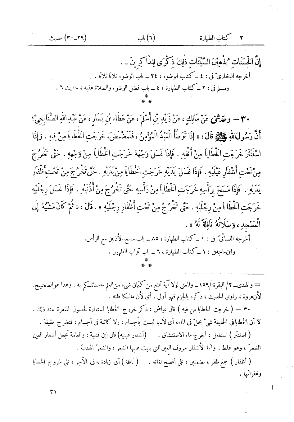 ٣٠ - وَحَدَّثَنِي عَنْ مَالِكٍ، عَنْ زَيْدِ بْنِ أَسْلَمَ، عَنْ عَطَاءِ بْنِ يَسَارٍ، عَنْ عَبْدِ اللَّهِ الصُّنَابِحِيِّ، أَنَّ رَسُولَ اللَّهِ صَلَّى اللهُ عَلَيْهِ وَسَلَّمَ قَالَ: «إِذَا تَوَضَّأَ الْعَبْدُ الْمُؤْمِنُ، فَتَمَضْمَضَ خَرَجَتِ الْخَطَايَا مِنْ فِيهِ وَإِذَا اسْتَنْثَرَ خَرَجَتِ الْخَطَايَا مِنْ أَنْفِهِ، فَإِذَا غَسَلَ وَجْهَهُ خَرَجَتِ الْخَطَايَا مِنْ وَجْهِهِ، حَتَّى تَخْرُجَ مِنْ تَحْتِ أَشْفَارِ عَيْنَيْهِ، فَإِذَا غَسَلَ يَدَيْهِ خَرَجَتِ الْخَطَايَا مِنْ يَدَيْهِ، حَتَّى تَخْرُجَ مِنْ تَحْتِ أَظْفَارِ يَدَيْهِ. فَإِذَا مَسَحَ بِرَأْسِهِ خَرَجَتِ الْخَطَايَا مِنْ رَأْسِهِ، حَتَّى تَخْرُجَ مِنْ أُذُنَيْهِ. فَإِذَا غَسَلَ رِجْلَيْهِ خَرَجَتِ الْخَطَايَا مِنْ رِجْلَيْهِ، حَتَّى تَخْرُجَ مِنْ تَحْتِ أَظْفَارِ رِجْلَيْهِ.» قَالَ: «ثُمَّ كَانَ مَشْيُهُ إِلَى الْمَسْجِدِ وَصَلَاتُهُ نَافِلَةً لَهُ»