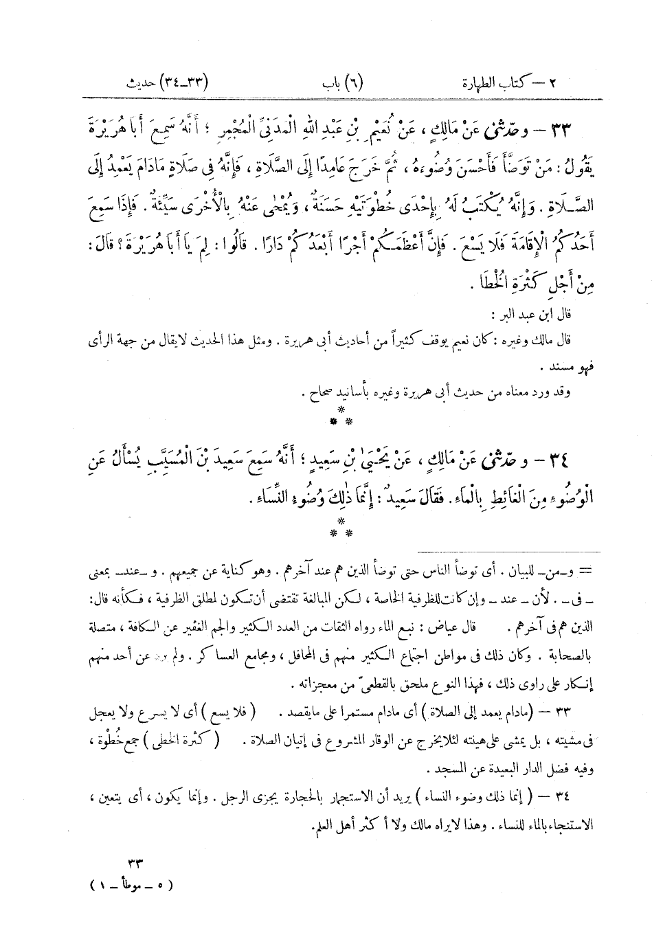 ٣٣ - وَحَدَّثَنِي عَنْ مَالِكٍ، عَنْ نُعَيْمِ بْنِ عَبْدِ اللَّهِ الْمَدَنِيِّ الْمُجْمِرِ، أَنَّهُ سَمِعَ أَبَا هُرَيْرَةَ يَقُولُ: «مَنْ تَوَضَّأَ فَأَحْسَنَ وُضُوءَهُ، ثُمَّ خَرَجَ عَامِدًا إِلَى الصَّلَاةِ، فَإِنَّهُ فِي صَلَاةٍ مَادَامَ يَعْمِدُ إِلَى الصَّلَاةِ. وَإِنَّهُ يُكْتَبُ لَهُ بِإِحْدَى خُطْوَتَيْهِ حَسَنَةٌ، وَيُمْحَى عَنْهُ بِالْأُخْرَى سَيِّئَةٌ. فَإِذَا سَمِعَ أَحَدُكُمُ الْإِقَامَةَ فَلَا يَسْعَ. فَإِنَّ أَعْظَمَكُمْ أَجْرًا أَبْعَدُكُمْ دَارًا»، قَالُوا: لِمَ يَا أَبَا هُرَيْرَةَ؟ قَالَ: «مِنْ أَجْلِ كَثْرَةِ الْخُطَا»