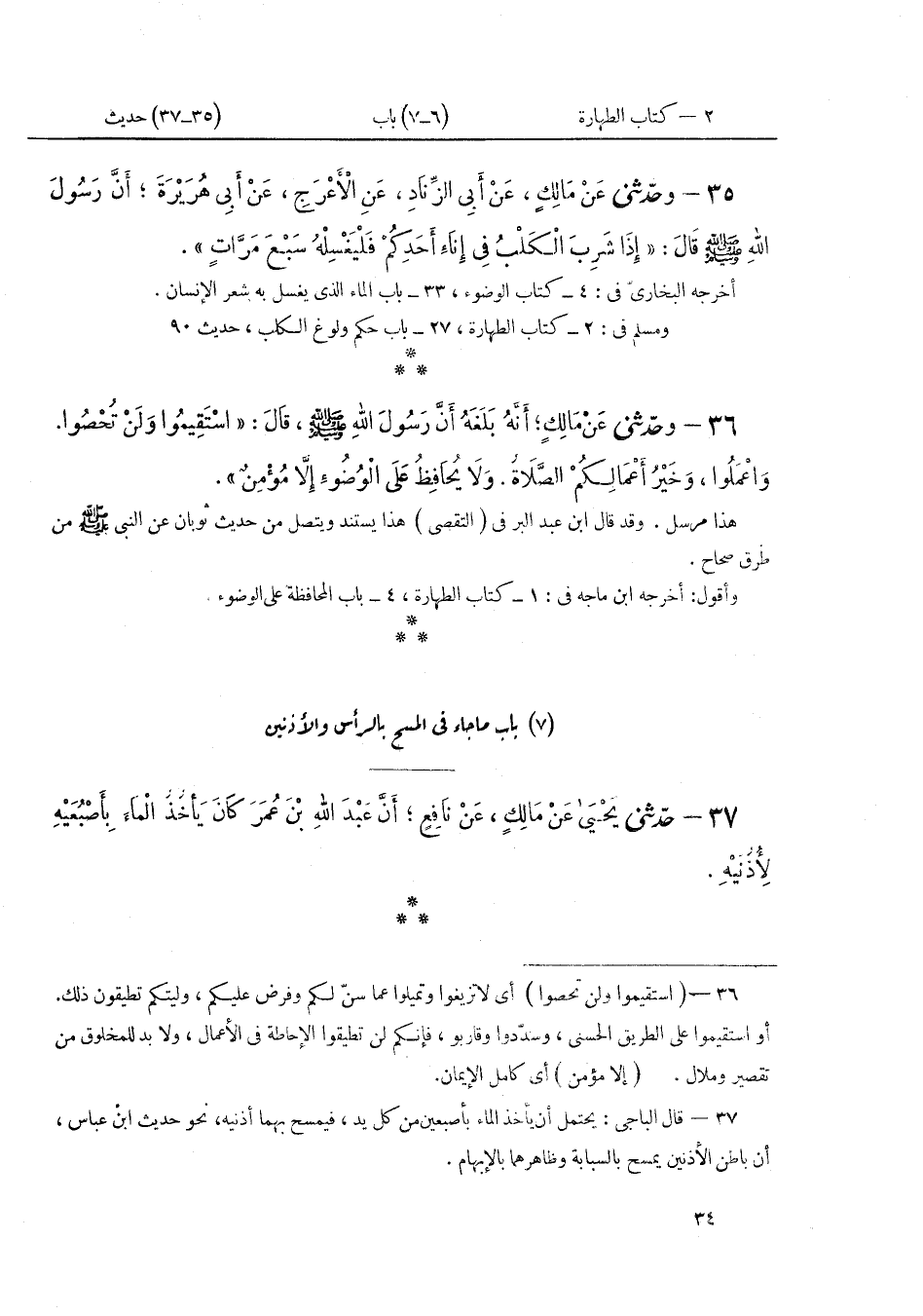 ٣٧ - حَدَّثَنِي يَحْيَى، عَنْ مَالِكٍ عَنْ نَافِعٍ، أَنَّ عَبْدَ اللَّهِ بْنَ عُمَرَ كَانَ «يَأْخُذُ الْمَاءَ بِأُصْبُعَيْهِ لِأُذُنَيْهِ»