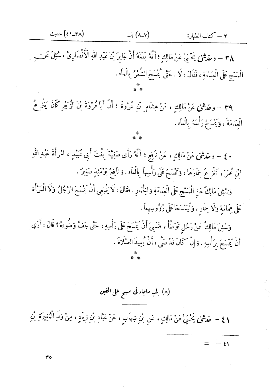 ٣٨ - وَحَدَّثَنِي يَحْيَى، عَنْ مَالِكٍ أَنَّهُ بَلَغَهُ أَنَّ جَابِرَ بْنَ عَبْدِ اللَّهِ الْأَنْصَارِيَّ، سُئِلَ عَنِ الْمَسْحِ عَلَى الْعِمَامَةِ؟ فَقَالَ: «لَا. حَتَّى يُمْسَحَ الشَّعْرُ بِالْمَاءِ»