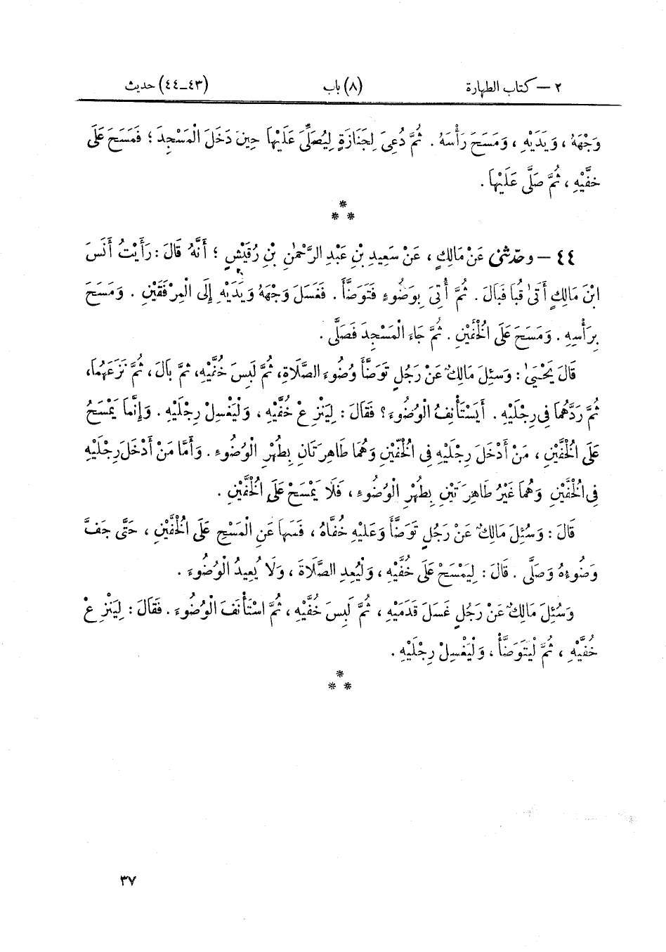 ٤٤ - وَحَدَّثَنِي عَنْ مالِكٍ، عَنْ سَعِيدِ بْنِ عَبْدِ الرَّحْمَنِ بْنِ رُقَيْشٍ، أَنَّهُ قَالَ: رَأَيْتُ أَنَسَ بْنَ مالِكٍ أَتَى قُبَا فَبَالَ. ثُمَّ «أُتِيَ بِوَضُوءٍ فَتَوَضَّأَ، فَغَسَلَ وَجْهَهُ وَيَدَيْهِ إِلَى الْمِرْفَقَيْنِ، وَمَسَحَ بِرَأْسِهِ. وَمَسَحَ عَلَى الْخُفَّيْنِ. ثُمَّ جَاءَ الْمَسْجِدَ فَصَلَّى» قَالَ يَحْيَى: وَسُئِلَ مَالِكٌ عَنْ رَجُلٍ تَوَضَّأَ وُضُوءَ الصَّلَاةِ، ثُمَّ لَبِسَ خُفَّيْهِ، ثُمَّ بَالَ، ثُمَّ نَزَعَهُمَا، ثُمَّ رَدَّهُمَا فِي رِجْلَيْهِ، أَيَسْتَأْنِفُ الْوُضُوءَ؟ فَقَالَ: «لِيَنْزِعْ خُفَّيْهِ، وَلْيَغْسِلْ رِجْلَيْهِ، وَإِنَّمَا يَمْسَحُ عَلَى الْخُفَّيْنِ، مَنْ أَدْخَلَ رِجْلَيْهِ فِي الْخُفَّيْنِ وَهُمَا طَاهِرَتَانِ بِطُهْرِ الْوُضُوءِ. وَأَمَّا مَنْ أَدْخَلَ رِجْلَيْهِ فِي الْخُفَّيْنِ وَهُمَا غَيْرُ طَاهِرَتَيْنِ بِطُهْرِ الْوُضُوءِ، فَلَا يَمْسَحُ عَلَى الْخُفَّيْنِ» قَالَ: وَسُئِلَ مَالكٌ عَنْ رَجُلٍ تَوَضَّأَ وَعَلَيْهِ خُفَّاهُ، فَسَهَا عَنِ الْمَسْحِ عَلَى الْخُفَّيْنِ، حَتَّى جَفَّ وَضُوءهُ وَصَلَّى. قَالَ: «لِيَمْسَحْ عَلَى خُفَّيْهِ، وَلْيُعِدِ الصَّلَاةَ وَلَا يُعِيدُ الْوُضُوءَ» وَسُئِلَ مَالِكٌ عَنْ رَجُلٍ غَسَلَ قَدَمَيْهِ، ثُمَّ لَبِسَ خُفَّيْهِ، ثُمَّ اسْتَأْنَفَ الْوُضُوءَ. فَقَالَ: «لِيَنْزِعْ خُفَّيْهِ، ثُمَّ لْيَتَوَضَّأْ، وَلْيَغْسِلْ رِجْلَيْهِ»