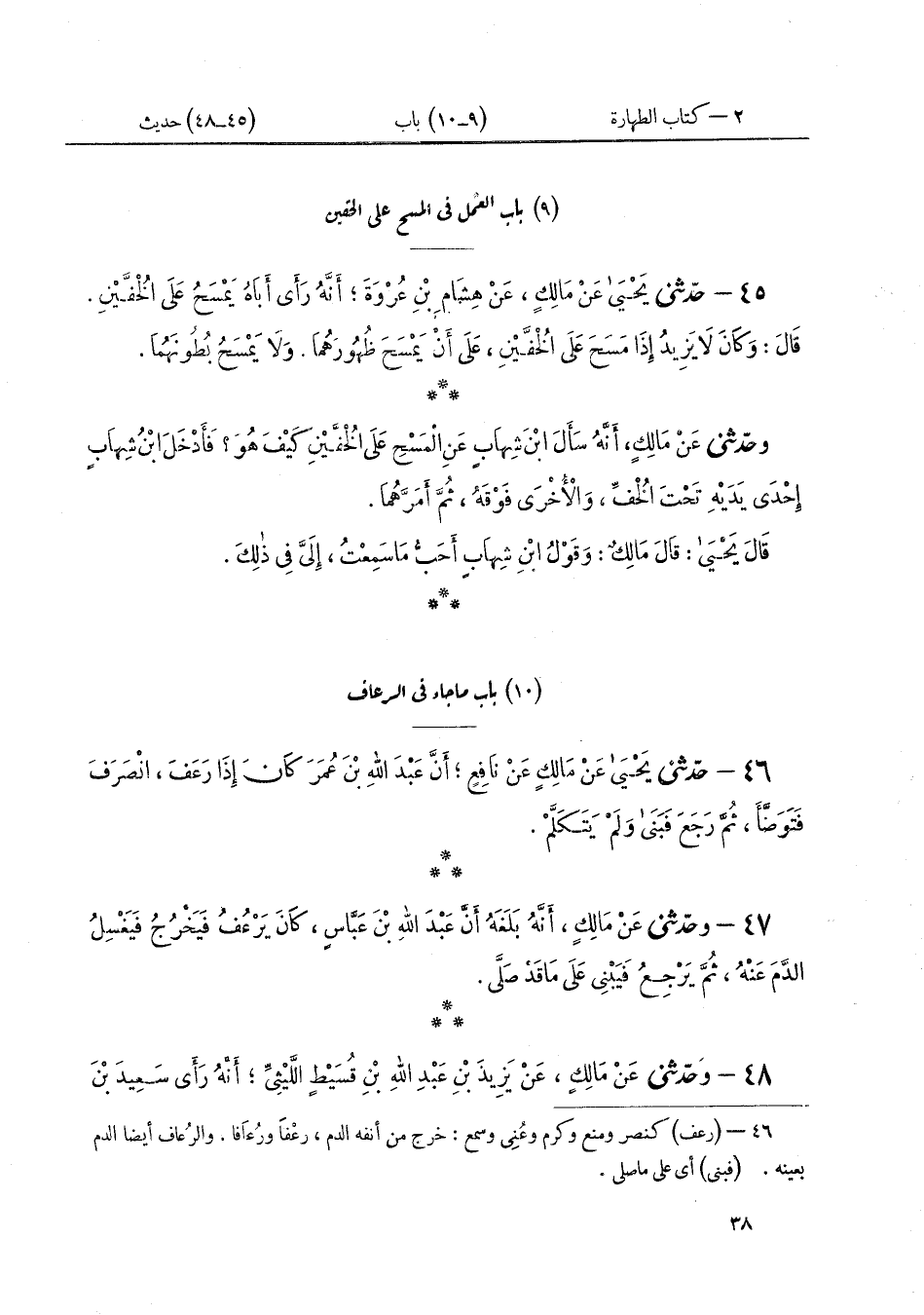 ٤٥ - حَدَّثَنِي يَحْيَى، عَنْ مَالِكٍ، عَنْ هِشَامِ بْنِ عُرْوَةَ، أَنَّهُ رَأَى أَبَاهُ «يَمْسَحُ عَلَى الْخُفَّيْنِ». قَالَ: وَكَانَ لَا يَزِيدُ إِذَا مَسَحَ عَلَى الْخُفَّيْنِ، عَلَى أَنْ يَمْسَحَ ظُهُورَهُمَا، وَلَا يَمْسَحُ بُطُونَهُمَا