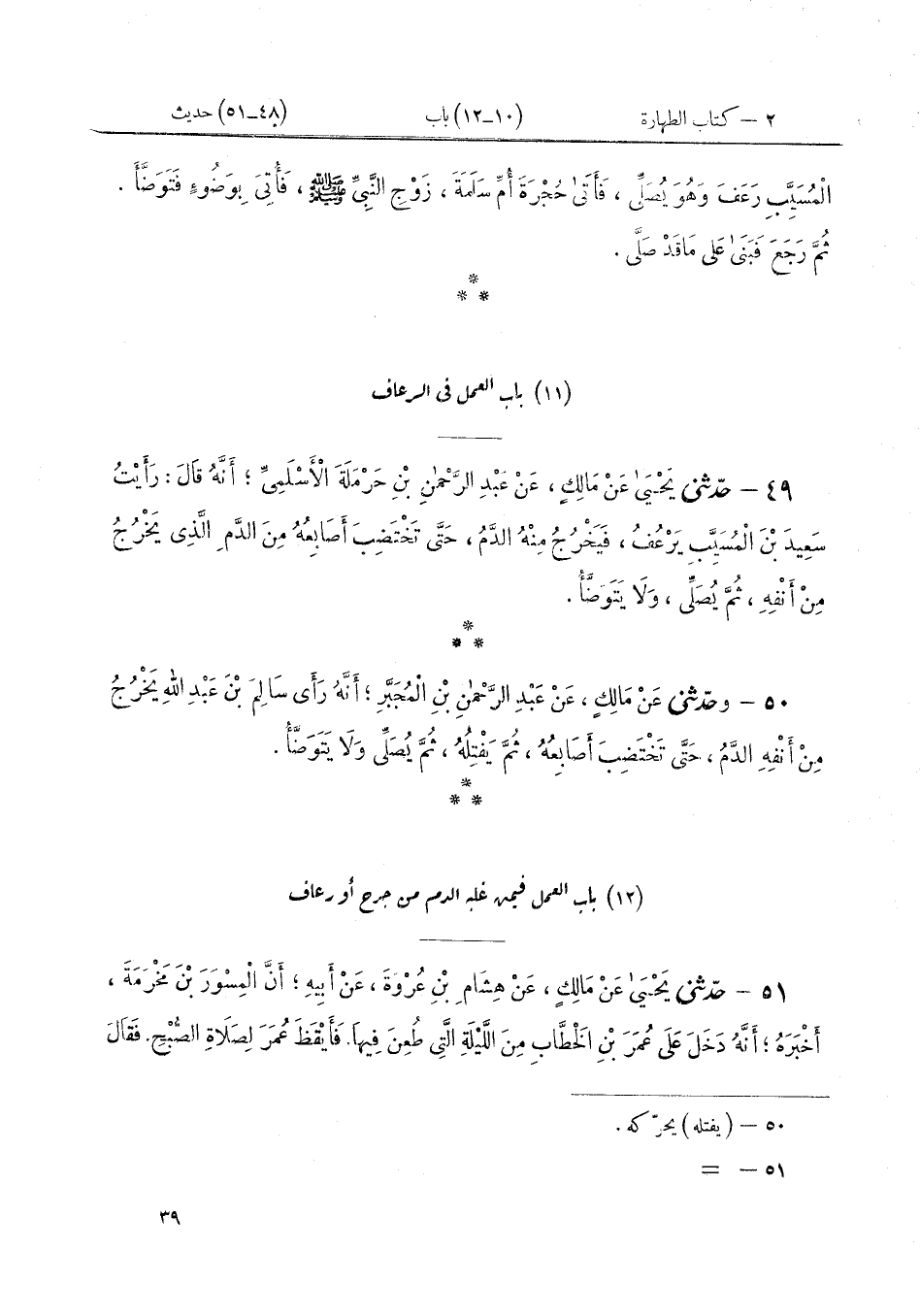٤٩ - حَدَّثَنِي يَحْيَى، عَنْ مَالِكٍ، عَنْ عَبْدِ الرَّحْمَنِ بْنِ حَرْمَلَةَ الْأَسْلَمِيِّ أَنَّهُ قَالَ: رَأَيْتُ سَعِيدَ بْنَ الْمُسَيِّبِ «يَرْعُفُ، فَيَخْرُجُ مِنْهُ الدَّمُ، حَتَّى تَخْتَضِبَ أَصَابِعُهُ مِنَ الدَّمِ الَّذِي يَخْرُجُ مِنْ أَنْفِهِ، ثُمَّ يُصَلِّي، وَلَا يَتَوَضَّأُ»