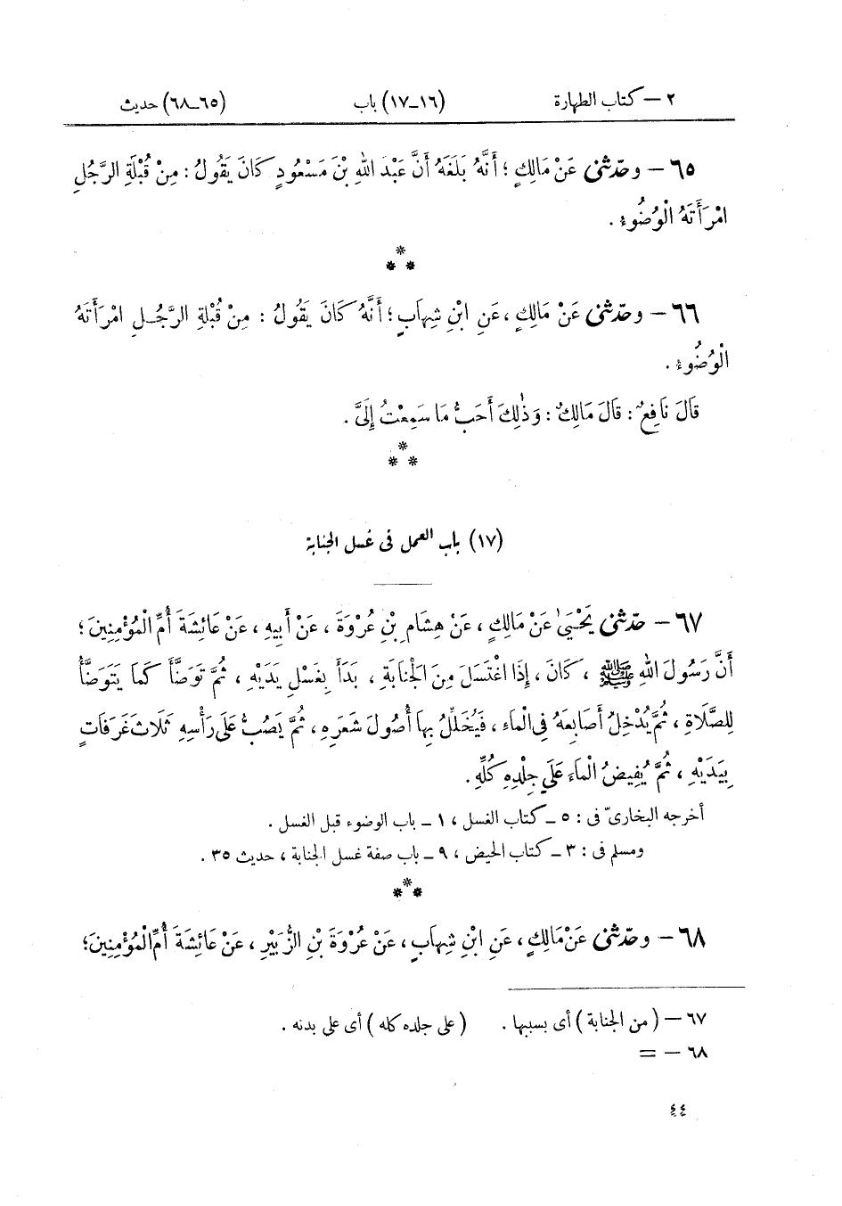 ٦٧ - حَدَّثَنِي يَحْيَى، عَنْ مَالِكٍ، عَنْ هِشَامِ بْنِ عُرْوَةَ عَنْ أَبِيهِ، عَنْ عَائِشَةَ أُمِّ الْمُؤْمِنِينَ أَنَّ رَسُولَ اللَّهِ صَلَّى اللهُ عَلَيْهِ وَسَلَّمَ، كَانَ إِذَا اغْتَسَلَ مِنَ الْجَنَابَةِ، بَدَأَ «بِغَسْلِ يَدَيْهِ، ثُمَّ تَوَضَّأَ كَمَا يَتَوَضَّأُ لِلصَّلَاةِ، ثُمَّ يُدْخِلُ أَصَابِعَهُ فِي الْمَاءِ، فَيُخَلِّلُ بِهَا أُصُولَ شَعَرِهِ، ثُمَّ يَصُبُّ عَلَى رَأْسِهِ ثَلَاثَ غَرَفَاتٍ بِيَدَيْهِ، ثُمَّ يُفِيضُ الْمَاءَ عَلَى جِلْدِهِ كُلِّهِ»