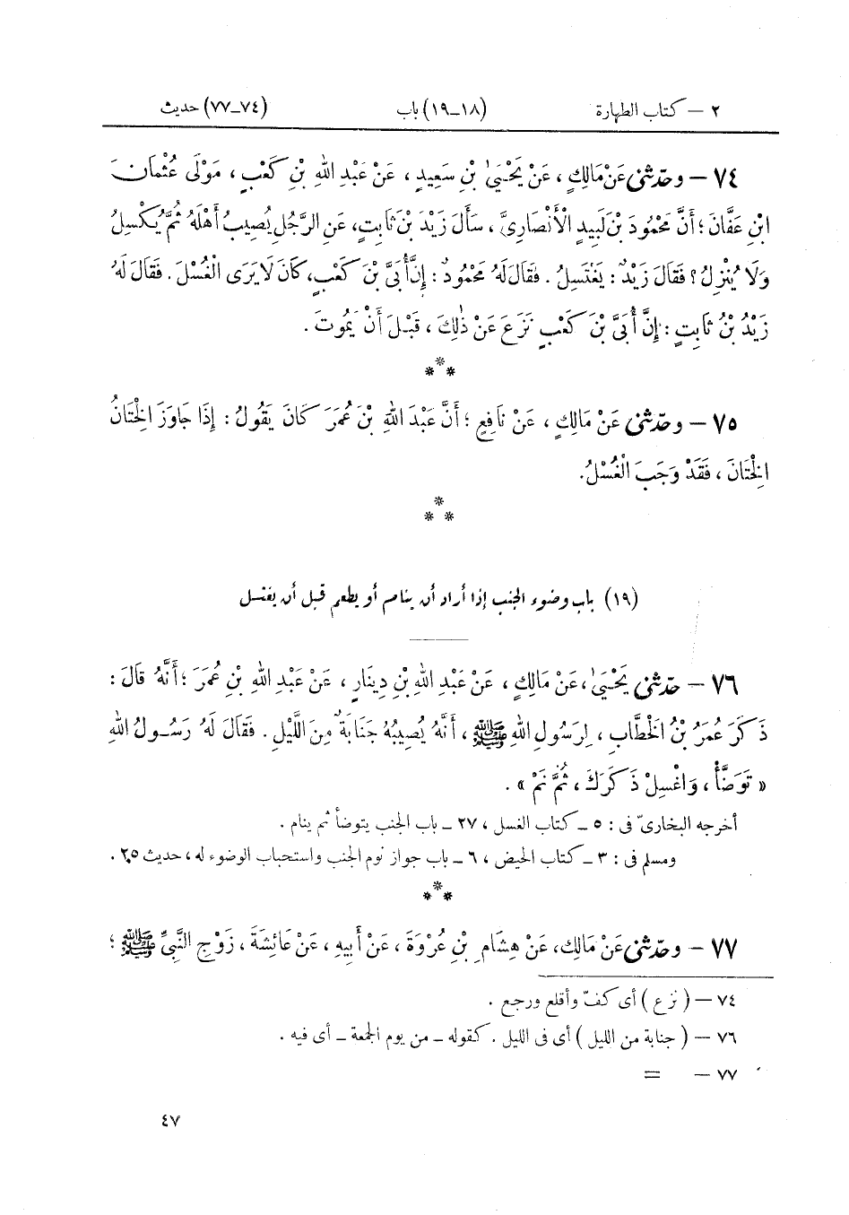 ٧٦ - حَدَّثَنِي يَحْيَى، عَنْ مَالِكٍ، عَنْ عَبْدِ اللَّهِ بْنِ دِينَارٍ، عَنْ عَبْدِ اللَّهِ بْنِ عُمَرَ، أَنَّهُ قَالَ: ذَكَرَ عُمَرُ بْنُ الْخَطَّابِ لِرَسُولِ اللَّهِ صَلَّى اللهُ عَلَيْهِ وَسَلَّمَ، أَنَّهُ يُصِيبُهُ جَنَابَةٌ مِنَ اللَّيْلِ. فَقَالَ لَهُ رَسُولُ اللَّهِ: «تَوَضَّأْ، وَاغْسِلْ ذَكَرَكَ، ثُمَّ نَمْ»