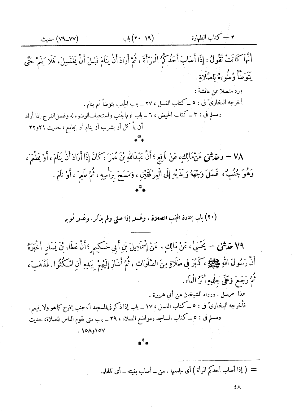 ٧٨ - وَحَدَّثَنِي عَنْ مَالِكٍ عَنْ نَافِعٍ، أَنَّ عَبْدَ اللَّهِ بْنَ عُمَرَ كَانَ إِذَا أَرَادَ أَنْ يَنَامَ أَوْ يَطْعَمَ وَهُوَ جُنُبٌ غَسَلَ وَجْهَهُ، وَيَدَيْهِ إِلَى الْمِرْفَقَيْنِ، وَمَسَحَ بِرَأْسِهِ، ثُمَّ طَعِمَ أَوْ نَامَ