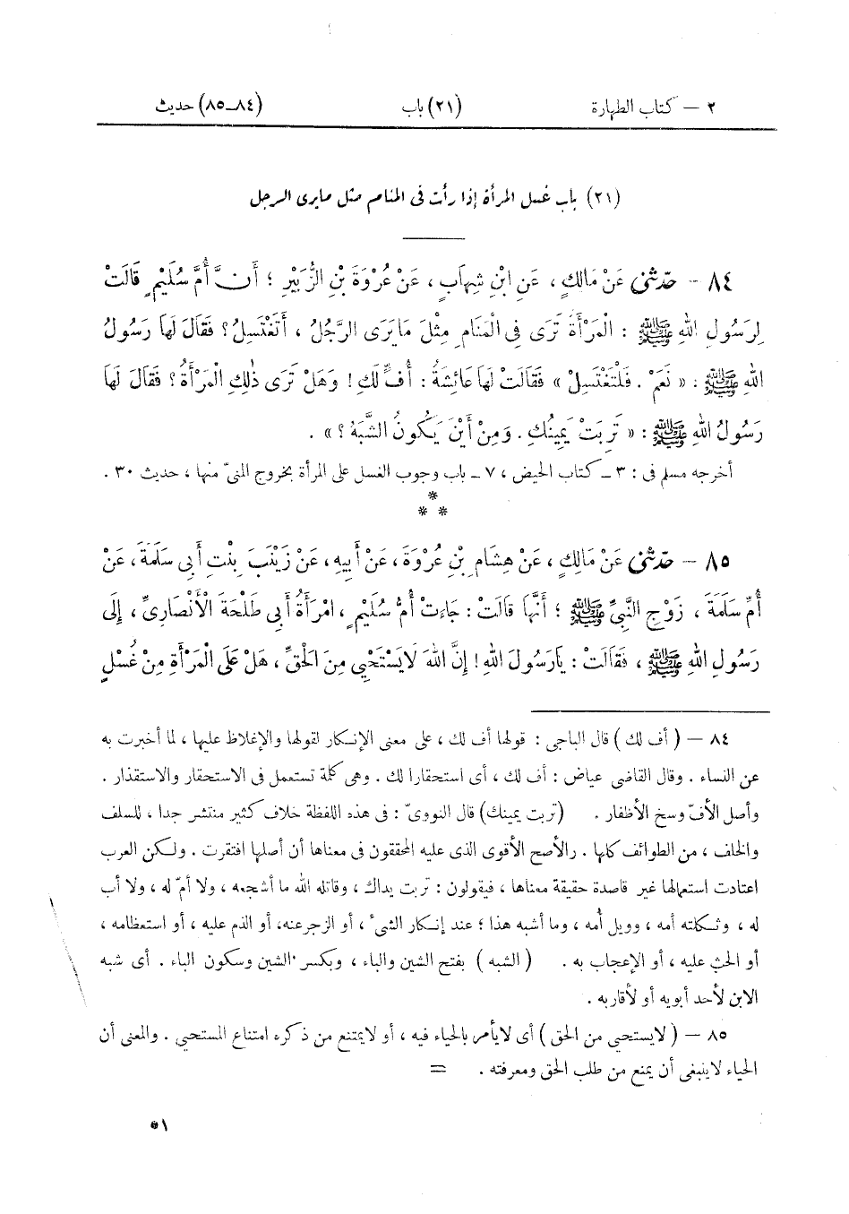 ٨٤ - حَدَّثَنِي عَنْ مَالِكٍ، عَنِ ابْنِ شِهابٍ، عَنْ عُرْوَةَ بْنِ الزُّبَيْرِ، أَنَّ أُمَّ سُلَيْمٍ قَالَتْ لِرَسُولِ اللَّهِ صَلَّى اللهُ عَلَيْهِ وَسَلَّمَ: الْمَرْأَةُ تَرَى فِي الْمَنَامِ مِثْلَ مَا يَرَى الرَّجُلُ، أَتَغْتَسِلُ؟ فَقَالَ لَهَا رَسُولُ اللَّهِ صَلَّى اللهُ عَلَيْهِ وَسَلَّمَ: «نَعَمْ فَلْتَغْتَسِلْ»، فَقَالَتْ لَهَا عَائِشَةُ: أُفٍّ لَكِ وَهَلْ تَرَى ذَلِكَ الْمَرْأَةُ؟ فَقَالَ لَهَا رَسُولُ اللَّهِ صَلَّى اللهُ عَلَيْهِ وَسَلَّمَ: «تَرِبَتْ يَمِينُكِ وَمِنْ أَيْنَ يَكُونُ الشَّبَهُ؟»