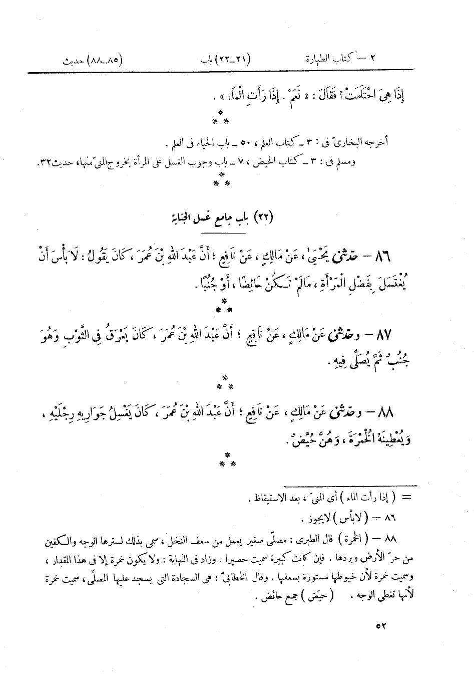 ٨٨ - وَحَدَّثَنِي عَنْ مَالِكٍ عَنْ نَافِعٍ، أَنَّ عَبْدَ اللَّهِ بْنَ عُمَرَ كَانَ «يَغْسِلُ جَوَارِيهِ رِجْلَيْهِ، وَيُعْطِينَهُ الْخُمْرَةَ وَهُنَّ حُيَّضٌ» ⦗٥٣⦘ وَسُئِلَ مَالِكٌ عَنْ رَجُلٍ لَهُ نِسْوَةٌ وَجَوَارِي، هَلْ يَطَؤُهُنَّ جَمِيعًا قَبْلَ أَنْ يَغْتَسِلَ؟ فَقَالَ: «لَا بَأْسَ بِأَنْ يُصِيبَ الرَّجُلُ جَارِيَتَيْهِ قَبْلَ أَنْ يَغْتَسِلَ. فَأَمَّا النِّسَاءُ الْحَرَائِرُ، فَيُكْرَهُ أَنْ يُصِيبَ الرَّجُلُ الْمَرْأَةَ الْحُرَّةَ فِي يَوْمِ الْأُخْرَى، فَأَمَّا أَنْ يُصِيبَ الْجَارِيَةَ ثُمَّ يُصِيبَ الْأُخْرَى وَهُوَ جُنُبٌ فَلَا بَأْسَ بِذَلِكَ» وَسُئِلَ مَالِكٌ عَنْ رَجُلٍ جُنُبٍ، وُضِعَ لَهُ مَاءٌ يَغْتَسِلُ بِهِ، فَسَهَا، فَأَدْخَلَ أُصْبُعَهُ فِيهِ، لِيَعْرِفَ حَرَّ الْمَاءِ مِنْ بَرْدِهِ، قَالَ مَالِكٌ: «إِنْ لَمْ يَكُنْ أَصَابَ أُصْبُعَهُ أَذًى، فَلَا أَرَى ذَلِكَ يُنَجِّسُ عَلَيْهِ الْمَاءَ»