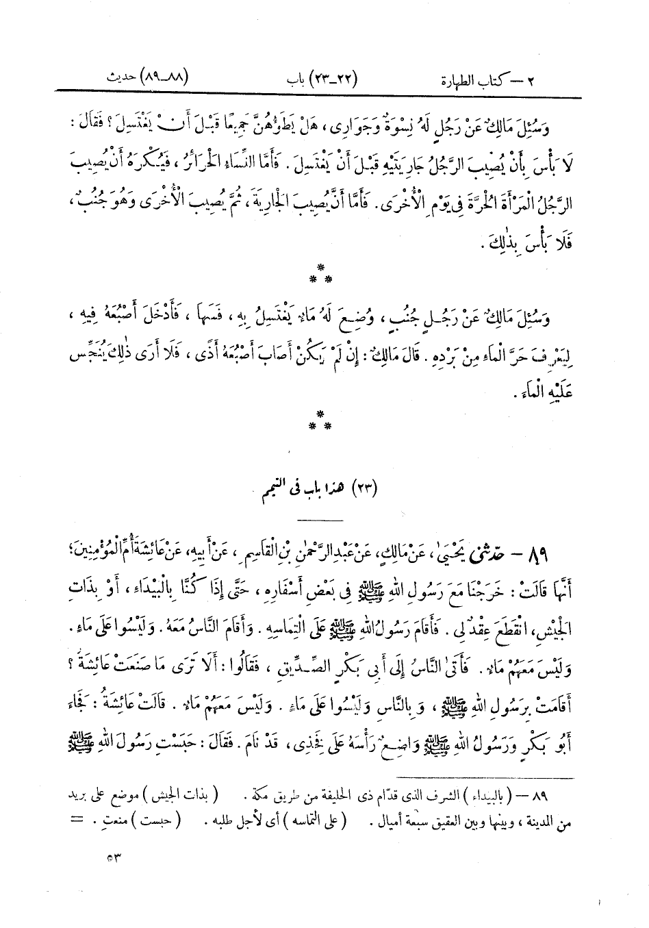 ٨٩ - حَدَّثَنِي يَحْيَى، عَنْ مَالِكٍ، عَنْ عَبْدِ الرَّحْمَنِ بْنِ الْقَاسِمِ عَنْ أَبِيهِ عَنْ عَائِشَةَ أُمِّ الْمُؤْمِنِينَ، أَنَّهَا قَالَتْ: خَرَجْنَا مَعَ رَسُولِ اللَّهِ صَلَّى اللهُ عَلَيْهِ وَسَلَّمَ فِي بَعْضِ أَسْفَارِهِ، حَتَّى إِذَا كُنَّا بِالْبَيْدَاءِ أَوْ بِذَاتِ الْجَيْشِ انْقَطَعَ عِقْدٌ لِي. فَأَقَامَ رَسُولُ اللَّهِ صَلَّى اللهُ عَلَيْهِ وَسَلَّمَ عَلَى الْتِمَاسِهِ. وَأَقَامَ النَّاسُ مَعَهُ. وَلَيْسُوا عَلَى مَاءٍ. وَلَيْسَ مَعَهُمْ مَاءٌ. فَأَتَى النَّاسُ إِلَى أَبِي بَكْرٍ الصِّدِّيقِ فَقَالُوا: أَلَا تَرَى مَا صَنَعَتْ عَائِشَةُ؟ أَقَامَتْ بِرَسُولِ اللَّهِ صَلَّى اللهُ عَلَيْهِ وَسَلَّمَ، وَبِالنَّاسِ وَلَيْسُوا عَلَى مَاءٍ وَلَيْسَ مَعَهُمْ مَاءٌ، قَالَتْ عَائِشَةُ فَجَاءَ أَبُو بَكْرٍ وَرَسُولُ اللَّهِ صَلَّى اللهُ عَلَيْهِ وَسَلَّمَ وَاضِعٌ رَأْسَهُ عَلَى فَخِذِي، قَدْ نَامَ فَقَالَ: حَبَسْتِ رَسُولَ اللَّهِ صَلَّى اللهُ عَلَيْهِ وَسَلَّمَ ⦗٥٤⦘ وَالنَّاسَ وَلَيْسُوا عَلَى مَاءٍ. وَلَيْسَ مَعَهُمْ مَاءٌ. قَالَتْ عَائِشَةُ: فَعَاتَبَنِي أَبُو بَكْرٍ، فَقَالَ مَا شَاءَ اللَّهُ أَنْ يَقُولَ. وَجَعَلَ يَطْعُنُ بِيَدِهِ فِي خَاصِرَتِي، فَلَا يَمْنَعُنِي مِنَ التَّحَرُّكِ إِلَّا مَكَانُ رَأْسِ رَسُولِ اللَّهِ صَلَّى اللهُ عَلَيْهِ وَسَلَّمَ عَلَى فَخِذِي. فَنَامَ رَسُولُ اللَّهِ صَلَّى اللهُ عَلَيْهِ وَسَلَّمَ حَتَّى أَصْبَحَ عَلَى غَيْرِ مَاءٍ، فَأَنْزَلَ اللَّهُ تَبَارَكَ وَتَعَالَى آيَةَ التَّيَمُّمِ فَتَيَمَّمُوا. فَقَالَ أُسَيْدُ بْنُ حُضَيْرٍ مَا هِيَ بِأَوَّلِ بَرَكَتِكُمْ يَا آلَ أَبِي بَكْرٍ. قَالَتْ: فَبَعَثْنَا الْبَعِيرَ الَّذِي كُنْتُ عَلَيْهِ فَوَجَدْنَا الْعِقْدَ تَحْتَهُ وَسُئِلَ مَالِكٌ عَنْ رَجُلٍ تَيَمَّمَ لِصَلَاةٍ حَضَرَتْ، ثُمَّ حَضَرَتْ صَلَاةٌ أُخْرَى، أَيَتَيَمَّمُ لَهَا أَمْ يَكْفِيهِ تَيَمُّمُهُ ذَلِكَ؟ فَقَالَ: «بَلْ يَتَيَمَّمُ لِكُلِّ صَلَاةٍ. لِأَنَّ عَلَيْهِ أَنْ يَبْتَغِيَ الْمَاءَ لِكُلِّ صَلَاةٍ. فَمَنِ ابْتَغَى الْمَاءَ فَلَمْ يَجِدْهُ، فَإِنَّهُ يَتَيَمَّمُ» ⦗٥٥⦘