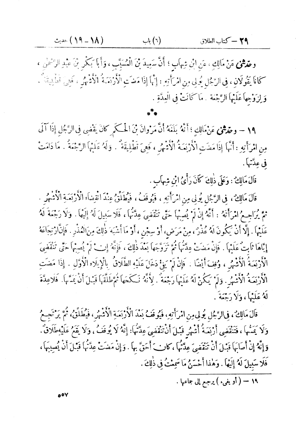 ١٩ - وَحَدَّثَنِي عَنْ مَالِكٍ أَنَّهُ بَلَغَهُ، أَنَّ مَرْوَانَ بْنَ الْحَكَمِ كَانَ يَقْضِي فِي الرَّجُلِ إِذَا «آلَى مِنِ امْرَأَتِهِ أَنَّهَا إِذَا مَضَتِ الْأَرْبَعَةُ الْأَشْهُرِ فَهِيَ تَطْلِيقَةٌ، وَلَهُ عَلَيْهَا الرَّجْعَةُ مَا دَامَتْ فِي عِدَّتِهَا» قَالَ مَالِكٌ: «وَعَلَى ذَلِكَ كَانَ رَأْيُ ابْنِ شِهَابٍ» قَالَ مَالِكٌ: «فِي الرَّجُلِ يُولِي مِنِ امْرَأَتِهِ، فَيُوقَفُ فَيُطَلِّقُ عِنْدَ انْقِضَاءِ الْأَرْبَعَةِ الْأَشْهُرِ، ثُمَّ يُرَاجِعُ امْرَأَتَهُ أَنَّهُ إِنْ لَمْ يُصِبْهَا حَتَّى تَنْقَضِيَ عِدَّتُهَا فَلَا سَبِيلَ لَهُ إِلَيْهَا، وَلَا رَجْعَةَ لَهُ عَلَيْهَا، إِلَّا أَنْ يَكُونَ لَهُ عُذْرٌ مِنْ مَرَضٍ أَوْ سِجْنٍ أَوْ مَا أَشْبَهَ ذَلِكَ مِنَ الْعُذْرِ، فَإِنَّ ارْتِجَاعَهُ إِيَّاهَا ثَابِتٌ عَلَيْهَا، فَإِنْ مَضَتْ عِدَّتُهَا ثُمَّ تَزَوَّجَهَا بَعْدَ ذَلِكَ فَإِنَّهُ إِنْ لَمْ يُصِبْهَا حَتَّى تَنْقَضِيَ الْأَرْبَعَةُ الْأَشْهُرِ وُقِفَ أَيْضًا، فَإِنْ لَمْ يَفِئْ دَخَلَ عَلَيْهِ الطَّلَاقُ بِالْإِيلَاءِ الْأَوَّلِ، إِذَا مَضَتِ الْأَرْبَعَةُ الْأَشْهُرِ، وَلَمْ يَكُنْ لَهُ عَلَيْهَا رَجْعَةٌ لِأَنَّهُ نَكَحَهَا ثُمَّ طَلَّقَهَا قَبْلَ أَنْ يَمَسَّهَا فَلَا عِدَّةَ لَهُ عَلَيْهَا وَلَا رَجْعَةَ» قَالَ مَالِكٌ: «فِي الرَّجُلِ يُولِي مِنِ امْرَأَتِهِ، فَيُوقَفُ بَعْدَ الْأَرْبَعَةِ الْأَشْهُرِ، فَيُطَلِّقُ ثُمَّ يَرْتَجِعُ وَلَا يَمَسُّهَا فَتَنْقَضِي أَرْبَعَةُ أَشْهُرٍ قَبْلَ أَنْ تَنْقَضِيَ عِدَّتُهَا، إِنَّهُ لَا يُوقَفُ وَلَا يَقَعُ عَلَيْهِ طَلَاقٌ، وَإِنَّهُ إِنْ أَصَابَهَا قَبْلَ أَنْ تَنْقَضِيَ عِدَّتُهَا كَانَ أَحَقَّ بِهَا، وَإِنْ مَضَتْ عِدَّتُهَا قَبْلَ أَنْ يُصِيبَهَا، فَلَا سَبِيلَ لَهُ إِلَيْهَا، وَهَذَا أَحْسَنُ مَا سَمِعْتُ فِي ذَلِكَ» ⦗٥٥٨⦘ قَالَ مَالِكٌ: " فِي الرَّجُلِ يُولِي مِنِ امْرَأَتِهِ، ثُمَّ يُطَلِّقُهَا فَتَنْقَضِي الْأَرْبَعَةُ الْأَشْهُرِ قَبْلَ انْقِضَاءِ عِدَّةِ الطَّلَاقِ، قَالَ: هُمَا تَطْلِيقَتَانِ إِنْ هُوَ وُقِفَ، وَلَمْ يَفِئْ وَإِنْ مَضَتْ عِدَّةُ الطَّلَاقِ قَبْلَ الْأَرْبَعَةِ الْأَشْهُرِ، فَلَيْسَ الْإِيلَاءُ بِطَلَاقٍ، وَذَلِكَ أَنَّ الْأَرْبَعَةَ الْأَشْهُرِ الَّتِي كَانَتْ تُوقَفُ بَعْدَهَا مَضَتْ وَلَيْسَتْ لَهُ يَوْمَئِذٍ بِامْرَأَةٍ " قَالَ مَالِكٌ: «وَمَنْ حَلَفَ أَنْ لَا يَطَأَ امْرَأَتَهُ يَوْمًا أَوْ شَهْرًا، ثُمَّ مَكَثَ حَتَّى يَنْقَضِيَ أَكْثَرُ مِنَ الْأَرْبَعَةِ الْأَشْهُرِ، فَلَا يَكُونُ ذَلِكَ إِيلَاءً، وَإِنَّمَا يُوقَفُ فِي الْإِيلَاءِ مَنْ حَلَفَ عَلَى أَكْثَرَ مِنَ الْأَرْبَعَةِ الْأَشْهُرِ، فَأَمَّا مَنْ حَلَفَ أَنْ لَا يَطَأَ امْرَأَتَهُ أَرْبَعَةَ أَشْهُرٍ أَوْ أَدْنَى مِنْ ذَلِكَ، فَلَا أَرَى عَلَيْهِ إِيلَاءً لِأَنَّهُ إِذَا دَخَلَ الْأَجَلُ الَّذِي يُوقَفُ عِنْدَهُ خَرَجَ مِنْ يَمِينِهِ وَلَمْ يَكُنْ عَلَيْهِ وَقْفٌ» قَالَ مَالِكٌ: «مَنْ حَلَفَ لِامْرَأَتِهِ أَنْ لَا يَطَأَهَا حَتَّى تَفْطِمَ وَلَدَهَا، فَإِنَّ ذَلِكَ لَا يَكُونُ إِيلَاءً، وَقَدْ بَلَغَنِي أَنَّ عَلِيَّ بْنَ أَبِي طَالِبٍ سُئِلَ عَنْ ذَلِكَ فَلَمْ يَرَهُ إِيلَاءً»