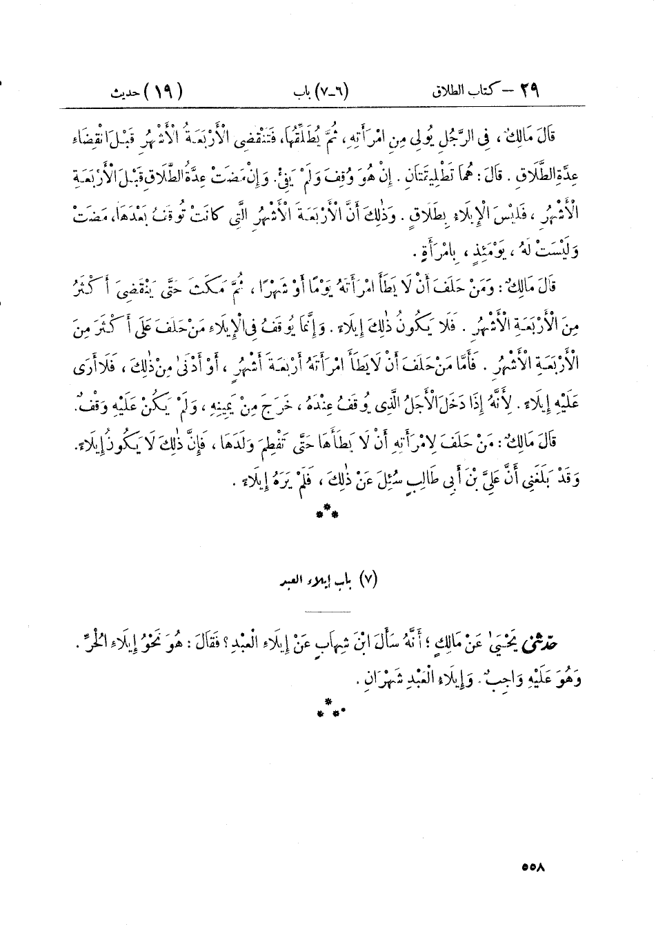 حَدَّثَنِي يَحْيَى، عَنْ مَالِكٍ، أَنَّهُ سَأَلَ ابْنَ شِهَابٍ: عَنْ إِيلَاءِ الْعَبْدِ فَقَالَ: «هُوَ نَحْوُ إِيلَاءِ الْحُرِّ، وَهُوَ عَلَيْهِ وَاجِبٌ وَإِيلَاءُ الْعَبْدِ شَهْرَانِ»