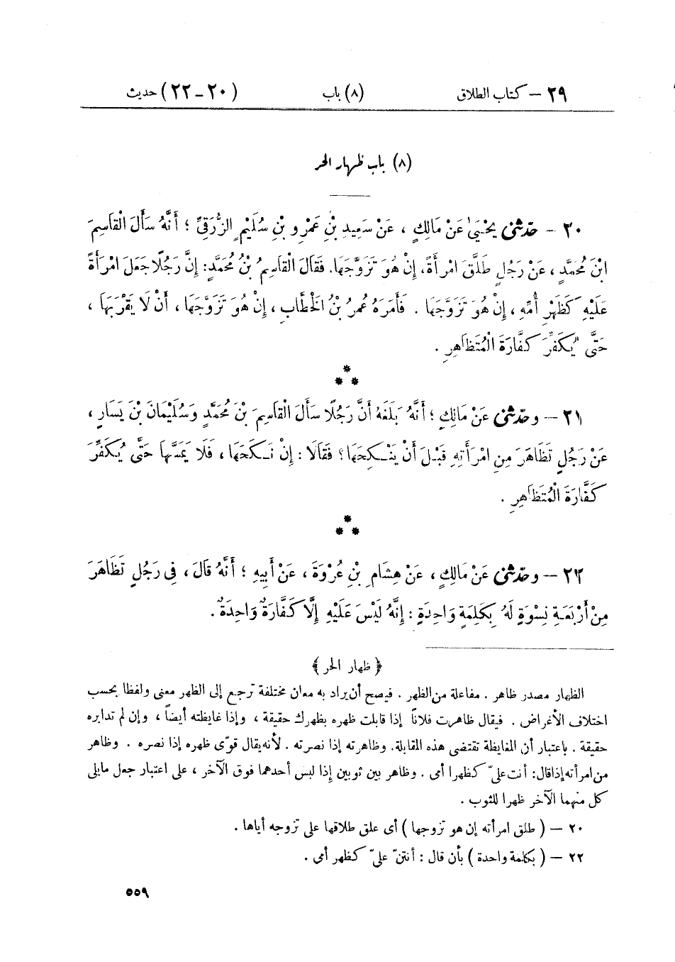 ٢٢ - وَحَدَّثَنِي عَنْ مَالِكٍ، عَنْ هِشَامِ بْنِ عُرْوَةَ، عَنْ أَبِيهِ أَنَّهُ قَالَ: «فِي رَجُلٍ تَظَاهَرَ مِنْ أَرْبَعَةِ نِسْوَةٍ لَهُ بِكَلِمَةٍ وَاحِدَةٍ، إِنَّهُ» لَيْسَ عَلَيْهِ إِلَّا كَفَّارَةٌ وَاحِدَةٌ ⦗٥٦٠⦘ وَحَدَّثَنِي عَنْ مَالِكٍ، عَنْ رَبِيعَةَ بْنِ أَبِي عَبْدِ الرَّحْمَنِ مِثْلَ ذَلِكَ قَالَ مَالِكٌ: " وَعَلَى ذَلِكَ الْأَمْرُ عِنْدَنَا قَالَ اللَّهُ تَعَالَى فِي كَفَّارَةِ الْمُتَظَاهِرِ {فَتَحْرِيرُ رَقَبَةٍ مِنْ قَبْلِ أَنْ يَتَمَاسَّا} [المجادلة: ٣] {فَمَنْ لَمْ يَجِدْ فَصِيَامُ شَهْرَيْنِ مُتَتَابِعَيْنِ مِنْ قَبْلِ أَنْ يَتَمَاسَّا، فَمَنْ لَمْ يَسْتَطِعْ فَإِطْعَامُ سِتِّينَ مِسْكِينًا} [المجادلة: ٤] قالَ مَالِكٌ: " فِي الرَّجُلِ يَتَظَاهَرُ مِنِ امْرَأَتِهِ فِي مَجَالِسَ مُتَفَرِّقَةٍ، قَالَ: لَيْسَ عَلَيْهِ إِلَّا كَفَّارَةٌ وَاحِدَةٌ، فَإِنْ تَظَاهَرَ ثُمَّ كَفَّرَ، ثُمَّ تَظَاهَرَ بَعْدَ أَنْ يُكَفِّرَ فَعَلَيْهِ الْكَفَّارَةُ أَيْضًا " قَالَ مَالِكٌ: «وَمَنْ تَظَاهَرَ مِنِ امْرَأَتِهِ، ثُمَّ مَسَّهَا قَبْلَ أَنْ يُكَفِّرَ لَيْسَ عَلَيْهِ إِلَّا كَفَّارَةٌ وَاحِدَةٌ، وَيَكُفُّ عَنْهَا، حَتَّى يُكَفِّرَ، وَلْيَسْتَغْفِرِ اللَّهَ وَذَلِكَ أَحْسَنُ مَا سَمِعْتُ» قَالَ مَالِكٌ: " وَالظِّهَارُ مِنْ ذَوَاتِ الْمَحَارِمِ مِنَ الرَّضَاعَةِ وَالنَّسَبِ سَوَاءٌ قَالَ مَالِكٌ: «وَلَيْسَ عَلَى النِّسَاءِ ظِهَارٌ» قَالَ مَالِكٌ: فِي قَوْلِ اللَّهِ تَبَارَكَ وَتَعَالَى (وَالَّذِينَ يَظَّاهَرُونَ) مِنْ نِسَائِهِمْ ثُمَّ يَعُودُونَ لِمَا قَالُوا قَالَ: «سَمِعْتُ أَنَّ تَفْسِيرَ ذَلِكَ أَنْ يَتَظَاهَرَ الرَّجُلُ مِنِ امْرَأَتِهِ، ثُمَّ يُجْمِعَ عَلَى إِمْسَاكِهَا وَإِصَابَتِهَا، فَإِنْ أَجْمَعَ عَلَى ذَلِكَ فَقَدْ وَجَبَتْ عَلَيْهِ الْكَفَّارَةُ، وَإِنْ طَلَّقَهَا، وَلَمْ يُجْمِعْ بَعْدَ تَظَاهُرِهِ مِنْهَا عَلَى إِمْسَاكِهَا، وَإِصَابَتِهَا فَلَا كَفَّارَةَ عَلَيْهِ» قَالَ مَالِكٌ: «فَإِنْ تَزَوَّجَهَا بَعْدَ ذَلِكَ لَمْ يَمَسَّهَا، حَتَّى يُكَفِّرَ كَفَّارَةَ الْمُتَظَاهِرِ» قَالَ مَالِكٌ: فِي الرَّجُلِ يَتَظَاهَرُ مِنْ أَمَتِهِ، إِنَّهُ «إِنْ أَرَادَ أَنْ يُصِيبَهَا فَعَلَيْهِ كَفَّارَةُ الظِّهَارِ قَبْلَ أَنْ يَطَأَهَا» ⦗٥٦١⦘ قَالَ مَالِكٌ: «لَا يَدْخُلُ عَلَى الرَّجُلِ إِيلَاءٌ فِي تَظَاهُرِهِ، إِلَّا أَنْ يَكُونَ مُضَارًّا لَا يُرِيدُ أَنْ يَفِيءَ مِنْ تَظَاهُرِهِ»