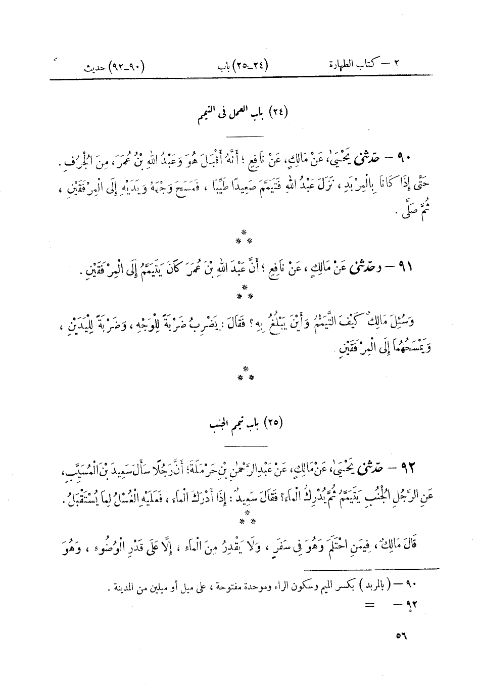 ٩٠ - حَدَّثَنِي يَحْيَى، عَنْ مَالِكٍ عَنْ نَافِعٍ، أَنَّهُ أَقْبَلَ هُوَ وَعَبْدُ اللَّهِ بْنُ عُمَرَ مِنَ الْجُرُفِ حَتَّى إِذَا كَانَا بِالْمِرْبَدِ نَزَلَ عَبْدُ اللَّهِ «فَتَيَمَّمَ صَعِيدًا طَيِّبًا، فَمَسَحَ وَجْهَهُ، وَيَدَيْهِ إِلَى الْمِرْفَقَيْنِ ثُمَّ صَلَّى»