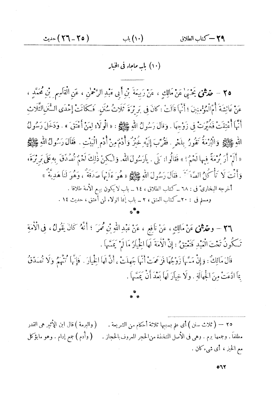٢٥ - حَدَّثَنِي يَحْيَى، عَنْ مالِكٍ، عَنْ رَبِيعَةَ بْنِ أَبِي عَبْدِ الرَّحْمَنِ، عَنِ الْقَاسِمِ بْنِ مُحَمَّدٍ، عَنْ عَائِشَةَ أُمِّ الْمُؤْمِنِينَ أَنَّهَا قَالَتْ: كَانَ فِي بَرِيرَةَ ثَلَاثُ سُنَنٍ، فَكَانَتْ إِحْدَى السُّنَنِ الثَّلَاثِ: أَنَّهَا أُعْتِقَتْ فَخُيِّرَتْ فِي زَوْجِهَا، وَقَالَ رَسُولُ اللَّهِ صَلَّى اللهُ عَلَيْهِ وَسَلَّمَ: " الْوَلَاءُ لِمَنْ أَعْتَقَ