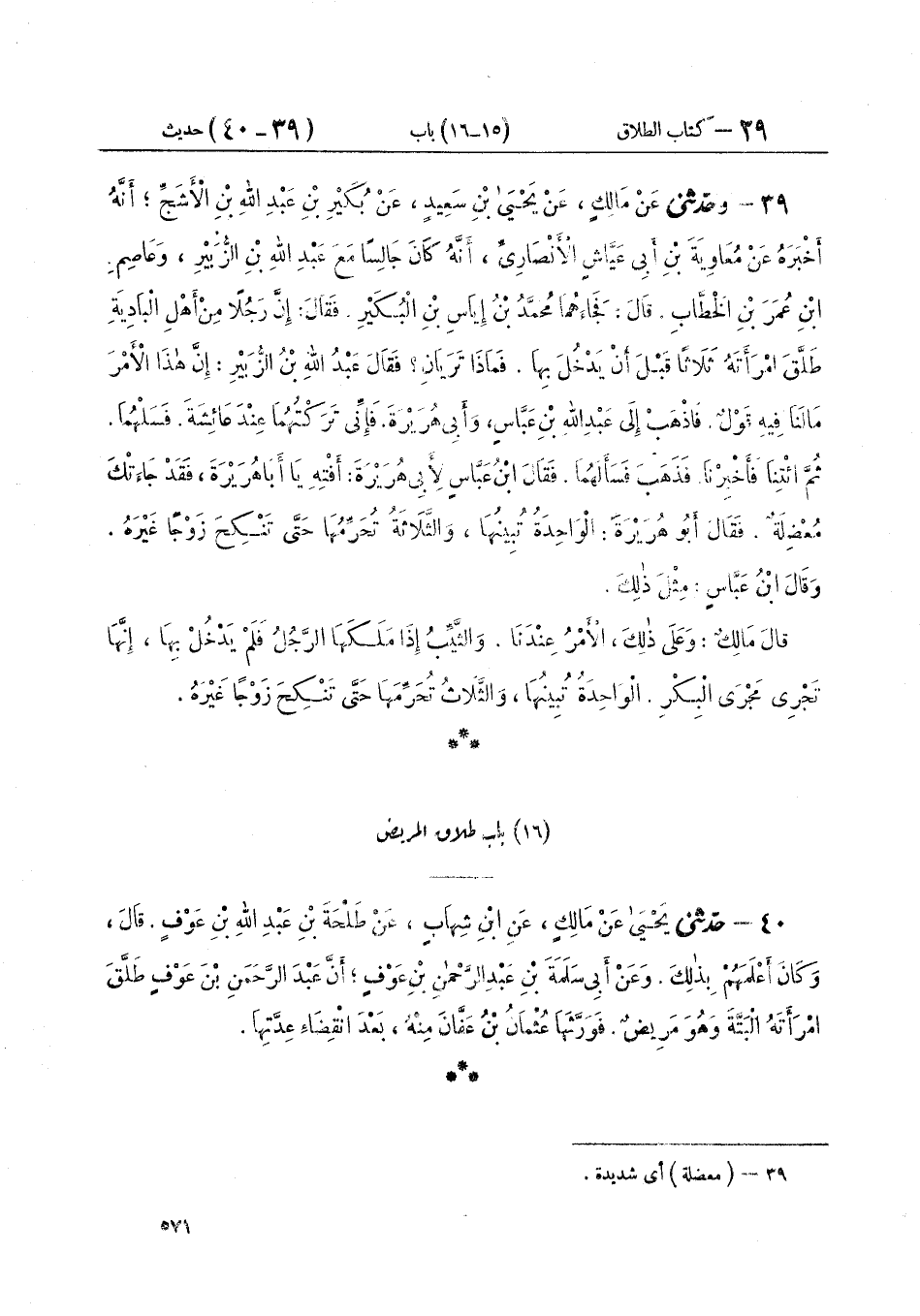 ٣٩ - وَحَدَّثَنِي عَنْ مَالِكٍ، عَنْ يَحْيَى بْنِ سَعِيدٍ، عَنْ بُكَيْرِ بْنِ عَبْدِ اللَّهِ بْنِ الْأَشَجِّ، أَنَّهُ أَخْبَرَهُ، عَنْ مُعَاوِيَةَ بْنِ أَبِي عَيَّاشٍ الْأَنْصَارِيِّ أَنَّهُ كَانَ جَالِسًا مَعَ عَبْدِ اللَّهِ بْنِ الزُّبَيْرِ وَعَاصِمِ بْنِ عُمَرَ بْنِ الْخَطَّابِ، قَالَ فَجَاءَهُمَا مُحَمَّدُ بْنُ إِيَاسِ بْنِ الْبُكَيْرِ فَقَالَ: إِنَّ رَجُلًا مِنْ أَهْلِ الْبَادِيَةِ طَلَّقَ امْرَأَتَهُ ثَلَاثًا قَبْلَ أَنْ يَدْخُلَ بِهَا، فَمَاذَا تَرَيَانِ؟ فَقَالَ عَبْدُ اللَّهِ بْنُ الزُّبَيْرِ إِنَّ هَذَا الْأَمْرَ مَا لَنَا فِيهِ قَوْلٌ، فَاذْهَبْ إِلَى عَبْدِ اللَّهِ بْنِ عَبَّاسٍ وَأَبِي هُرَيْرَةَ فَإِنِّي تَرَكْتُهُمَا عِنْدَ عَائِشَةَ، فَسَلْهُمَا ثُمَّ ائْتِنَا فَأَخْبِرْنَا، فَذَهَبَ فَسَأَلَهُمَا، فَقَالَ ابْنُ عَبَّاسٍ لِأَبِي هُرَيْرَةَ: أَفْتِهِ يَا أَبَا هُرَيْرَةَ فَقَدْ جَاءَتْكَ مُعْضِلَةٌ، فَقَالَ أَبُو هُرَيْرَةَ: " الْوَاحِدَةُ تُبِينُهَا، وَالثَّلَاثَةُ تُحَرِّمُهَا، حَتَّى تَنْكِحَ زَوْجًا غَيْرَهُ وَقَالَ ابْنُ عَبَّاسٍ مِثْلَ ذَلِكَ قَالَ مَالِكٌ: «وَعَلَى ذَلِكَ الْأَمْرُ عِنْدَنَا وَالثَّيِّبُ إِذَا مَلَكَهَا الرَّجُلُ فَلَمْ يَدْخُلْ بِهَا، أَنَّهَا تَجْرِي مَجْرَى الْبِكْرِ. الْوَاحِدَةُ تَبِينُهَا، وَالثَّلَاثُ تَحْرِمُهَا حَتَّى تَنْكِحَ زَوْجًا غَيْرَهُ»