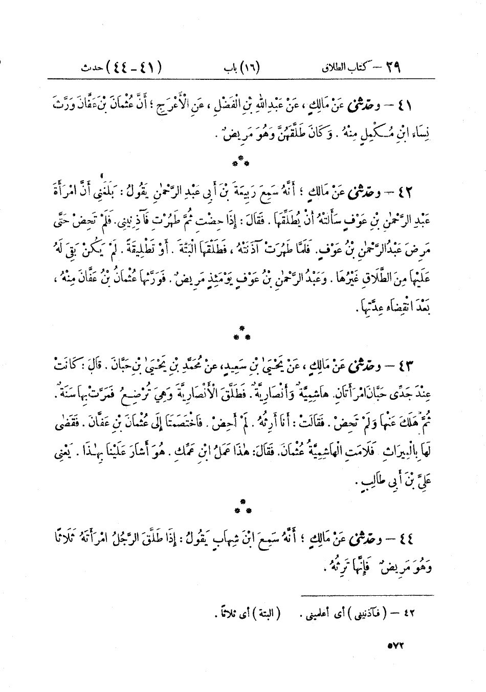 ٤٣ - وَحَدَّثَنِي عَنْ مَالِكٍ، عَنْ يَحْيَى بْنِ سَعِيدٍ، عَنْ مُحَمَّدِ بْنِ يَحْيَى بْنِ حَبَّانَ، قَالَ: كَانَتْ عِنْدَ جَدِّي حَبَّانَ امْرَأَتَانِ هَاشِمِيَّةٌ، وَأَنْصَارِيَّةٌ، فَطَلَّقَ الْأَنْصَارِيَّةَ، وَهِيَ تُرْضِعُ فَمَرَّتْ بِهَا سَنَةٌ ثُمَّ هَلَكَ عَنْهَا، وَلَمْ تَحِضْ، فَقَالَتْ: أَنَا أَرِثُهُ لَمْ أَحِضْ، فَاخْتَصَمَتَا إِلَى عُثْمَانَ بْنِ عَفَّانَ: " فَقَضَى لَهَا بِالْمِيرَاثِ، فَلَامَتِ الْهَاشِمِيَّةُ عُثْمَانَ فَقَالَ: هَذَا عَمَلُ ابْنِ عَمِّكِ هُوَ أَشَارَ عَلَيْنَا بِهَذَا يَعْنِي عَلِيَّ بْنَ أَبِي طَالِبٍ "