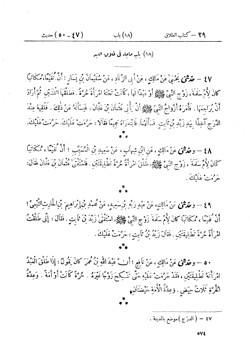 ٤٧ - حَدَّثَنِي يَحْيَى، عَنْ مَالِكٍ، عَنْ أَبِي الزِّنَادِ، عَنْ سُلَيْمَانَ بْنِ يَسَارٍ، أَنَّ نُفَيْعًا مُكَاتَبًا كَانَ لِأُمِّ سَلَمَةَ زَوْجِ النَّبِيِّ صَلَّى اللهُ عَلَيْهِ وَسَلَّمَ أَوْ عَبْدًا لَهَا كَانَتْ تَحْتَهُ امْرَأَةٌ حُرَّةٌ فَطَلَّقَهَا اثْنَتَيْنِ، ثُمَّ أَرَادَ أَنْ يُرَاجِعَهَا، فَأَمَرَهُ أَزْوَاجُ النَّبِيِّ صَلَّى اللهُ عَلَيْهِ وَسَلَّمَ أَنْ يَأْتِيَ عُثْمَانَ بْنَ عَفَّانَ فَيَسْأَلَهُ عَنْ ذَلِكَ، فَلَقِيَهُ عِنْدَ الدَّرَجِ آخِذًا بِيَدِ زَيْدِ بْنِ ثَابِتٍ فَسَأَلَهُمَا فَابْتَدَرَاهُ جَمِيعًا فَقَالَا: «حَرُمَتْ عَلَيْكَ حَرُمَتْ عَلَيْكَ»