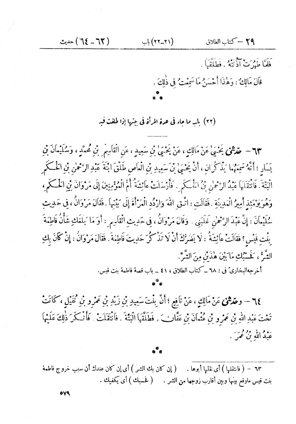 ٦٣ - حَدَّثَنِي يَحْيَى عَنْ مَالِكٍ، عَنْ يَحْيَى بْنِ سَعِيدٍ، عَنِ الْقَاسِمِ بْنِ مُحَمَّدٍ وَسُلَيْمَانَ بْنِ يَسَارٍ أَنَّهُ سَمِعَهُمَا يَذْكُرَانِ أَنَّ يَحْيَى بْنَ سَعِيدِ بْنِ الْعَاصِ طَلَّقَ ابْنَةَ عَبْدِ الرَّحْمَنِ بْنِ الْحَكَمِ الْبَتَّةَ، فَانْتَقَلَهَا عَبْدُ الرَّحْمَنِ بْنُ الْحَكَمِ، فَأَرْسَلَتْ عَائِشَةُ أُمُّ الْمُؤْمِنِينَ إِلَى مَرْوَانَ بْنِ الْحَكَمِ وَهُوَ يَوْمَئِذٍ أَمِيرُ الْمَدِينَةِ فقَالَتِ: «اتَّقِ اللَّهَ وَارْدُدِ الْمَرْأَةَ إِلَى بَيْتِهَا»، فَقَالَ مَرْوَانُ فِي حَدِيثِ سُلَيْمَانَ، إِنَّ عَبْدَ الرَّحْمَنِ غَلَبَنِي، وَقَالَ مَرْوَانُ فِي حَدِيثِ الْقَاسِمِ، أَوَمَا بَلَغَكِ شَأْنُ فَاطِمَةَ بِنْتِ قَيْسٍ؟ فَقَالَتْ عَائِشَةُ: " لَا يَضُرُّكَ أَنْ لَا تَذْكُرَ حَدِيثَ فَاطِمَةَ، فَقَالَ مَرْوَانُ: إِنْ كَانَ بِكِ الشَّرُّ فَحَسْبُكِ مَا بَيْنَ هَذَيْنِ مِنَ الشَّرِّ