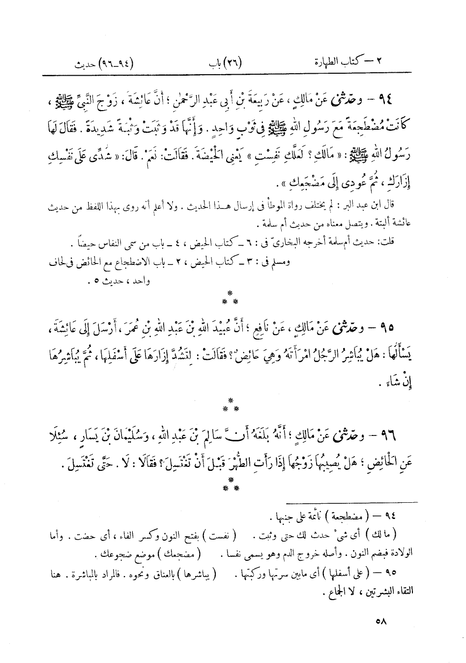 ٩٤ - وَحَدَّثَنِي عَنْ مَالِكٍ، عَنْ رَبِيعَةَ بْنِ أَبِي عَبْدِ الرَّحْمَنِ أَنَّ عَائِشَةَ، زَوْجَ النَّبِيِّ صَلَّى اللهُ عَلَيْهِ وَسَلَّمَ، كَانَتْ مُضْطَجِعَةً مَعَ رَسُولِ اللَّهِ صَلَّى اللهُ عَلَيْهِ وَسَلَّمَ فِي ثَوْبٍ وَاحِدٍ. وَأَنَّهَا قَدْ وَثَبَتْ وَثْبَةً شَدِيدَةً، فَقَالَ لَهَا رَسُولُ اللَّهِ صَلَّى اللهُ عَلَيْهِ وَسَلَّمَ: «مَا لَكِ؟ لَعَلَّكِ نَفِسْتِ»، يَعْنِي الْحَيْضَةَ. فَقَالَتْ: نَعَمْ، قَالَ: «شُدِّي عَلَى نَفْسِكِ إِزَارَكِ ثُمَّ عُودِي إِلَى مَضْجَعِكِ»