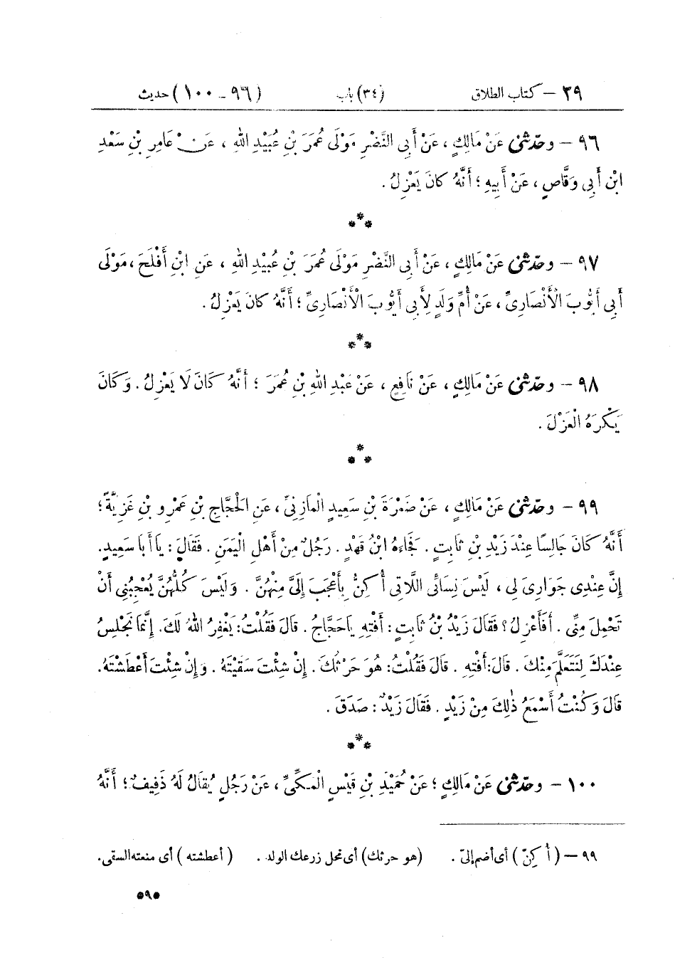 ٩٦ - وَحَدَّثَنِي عَنْ مَالِكٍ، عَنْ أَبِي النَّضْرِ، مَوْلَى عُمَرَ بْنِ عُبَيْدِ اللَّهِ، عَنْ عَامِرِ بْنِ سَعْدِ بْنِ أَبِي وَقَّاصٍ، عَنْ أَبِيهِ أَنَّهُ: «كَانَ يَعْزِلُ»