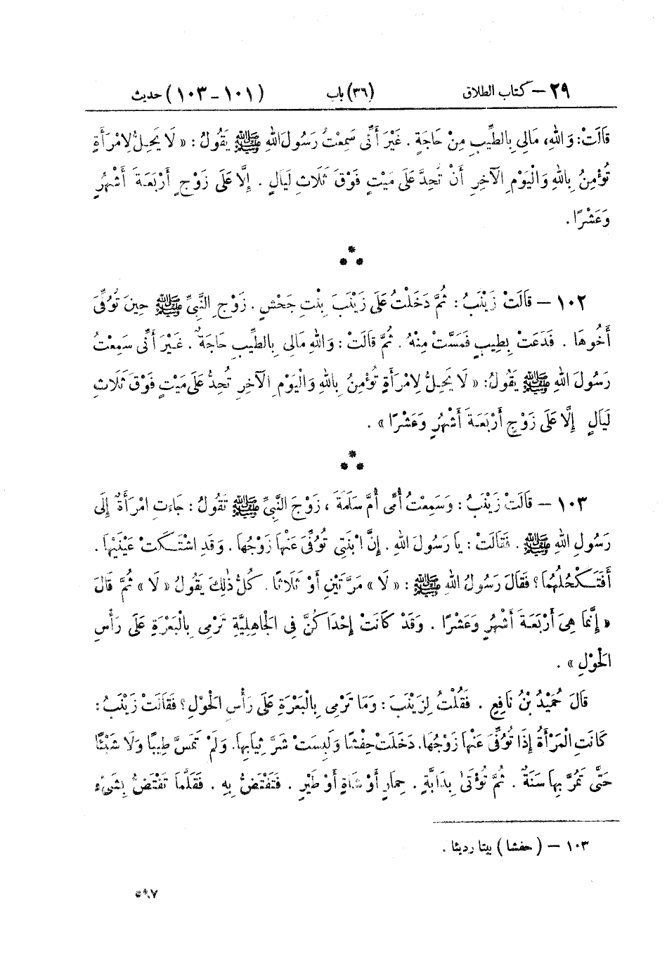 ١٠٢ - قَالَتْ زَيْنَبُ ثُمَّ دَخَلْتُ عَلَى زَيْنَبَ بِنْتِ جَحْشٍ زَوْجِ النَّبِيِّ صَلَّى اللهُ عَلَيْهِ وَسَلَّمَ حِينَ تُوُفِّيَ أَخُوهَا، فَدَعَتْ بِطِيبٍ فَمَسَّتْ مِنْهُ، ثُمَّ قَالَتْ: وَاللَّهِ مَا لِي بِالطِّيبِ حَاجَةٌ، غَيْرَ أَنِّي سَمِعْتُ رَسُولَ اللَّهِ صَلَّى اللهُ عَلَيْهِ وَسَلَّمَ يَقُولُ: «لَا يَحِلُّ لِامْرَأَةٍ تُؤْمِنُ بِاللَّهِ وَالْيَوْمِ الْآخِرِ تُحِدُّ عَلَى مَيْتٍ فَوْقَ ثَلَاثِ لَيَالٍ، إِلَّا عَلَى زَوْجٍ أَرْبَعَةَ أَشْهُرٍ وَعَشْرًا»