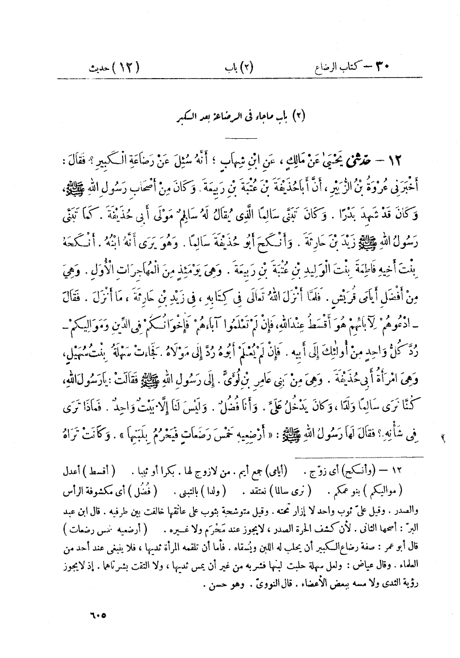 ١٢ - حَدَّثَنِي يَحْيَى، عَنْ مَالِكٍ، عَنِ ابْنِ شِهَابٍ، أَنَّهُ سُئِلَ عَنْ رَضَاعَةِ الْكَبِيرِ؟ فَقَالَ: أَخْبَرَنِي عُرْوَةُ بْنُ الزُّبَيْرِ، أَنَّ أَبَا حُذَيْفَةَ بْنَ عُتْبَةَ بْنِ رَبِيعَةَ وَكَانَ مِنْ أَصْحَابِ رَسُولِ اللَّهِ صَلَّى اللهُ عَلَيْهِ وَسَلَّمَ، وَكَانَ قَدْ شَهِدَ بَدْرًا، وَكَانَ تَبَنَّى سَالِمًا، الَّذِي يُقَالُ لَهُ سَالِمٌ، مَوْلَى أَبِي حُذَيْفَةَ، كَمَا تَبَنَّى رَسُولُ اللَّهِ صَلَّى اللهُ عَلَيْهِ وَسَلَّمَ زَيْدَ بْنَ حَارِثَةَ، وَأَنْكَحَ أَبُو حُذَيْفَةَ سَالِمًا، وَهُوَ يَرَى أَنَّهُ ابْنُهُ أَنْكَحَهُ بِنْتَ أَخِيهِ فَاطِمَةَ بِنْتَ الْوَلِيدِ بْنِ عُتْبَةَ بْنِ رَبِيعَةَ، وَهِيَ يَوْمَئِذٍ مِنَ الْمُهَاجِرَاتِ الْأُوَلِ، وَهِيَ مِنْ أَفْضَلِ أَيَامَى قُرَيْشٍ، فَلَمَّا أَنْزَلَ اللَّهُ تَعَالَى فِي كِتَابِهِ فِي زَيْدِ بْنِ حَارِثَةَ مَا أَنْزَلَ فَقَالَ {ادْعُوهُمْ لِآبَائِهِمْ هُوَ أَقْسَطُ عِنْدَ اللَّهِ، فَإِنْ لَمْ تَعْلَمُوا آبَاءَهُمْ، فَإِخْوَانُكُمْ فِي الدِّينِ، وَمَوَالِيكُمْ} [الأحزاب: ٥] رُدَّ كُلُّ وَاحِدٍ مِنْ أُولَئِكَ إِلَى أَبِيهِ، فَإِنْ لَمْ يُعْلَمْ أَبُوهُ رُدَّ إِلَى مَوْلَاهُ، فَجَاءَتْ سَهْلَةُ بِنْتُ سُهَيْلٍ وَهِيَ امْرَأَةُ أَبِي حُذَيْفَةَ، وَهِيَ مِنْ بَنِي عَامِرِ بْنِ لُؤَيٍّ إِلَى رَسُولِ اللَّهِ صَلَّى اللهُ عَلَيْهِ وَسَلَّمَ، فَقَالَتْ يَا رَسُولَ اللَّهِ: كُنَّا نَرَى سَالِمًا وَلَدًا وَكَانَ يَدْخُلُ عَلَيَّ، وَأَنَا فُضُلٌ وَلَيْسَ لَنَا إِلَّا بَيْتٌ وَاحِدٌ، فَمَاذَا تَرَى فِي شَأْنِهِ؟ فَقَالَ لَهَا رَسُولُ اللَّهِ صَلَّى اللهُ عَلَيْهِ وَسَلَّمَ «أَرْضِعِيهِ خَمْسَ رَضَعَاتٍ، فَيَحْرُمُ بِلَبَنِهَا»، وَكَانَتْ تَرَاهُ ⦗٦٠٦⦘ ابْنًا مِنَ الرَّضَاعَةِ، فَأَخَذَتْ بِذَلِكَ عَائِشَةُ أُمُّ الْمُؤْمِنِينَ فِيمَنْ كَانَتْ تُحِبُّ أَنْ يَدْخُلَ عَلَيْهَا مِنَ الرِّجَالِ، فَكَانَتْ تَأْمُرُ أُخْتَهَا أُمَّ كُلْثُومٍ بِنْتَ أَبِي بَكْرٍ الصِّدِّيقِ، وَبَنَاتِ أَخِيهَا أَنْ يُرْضِعْنَ مَنْ أَحَبَّتْ أَنْ يَدْخُلَ عَلَيْهَا مِنَ الرِّجَالِ، وَأَبَى سَائِرُ أَزْوَاجِ النَّبِيِّ صَلَّى اللهُ عَلَيْهِ وَسَلَّمَ أَنْ يَدْخُلَ عَلَيْهِنَّ بِتِلْكَ الرَّضَاعَةِ أَحَدٌ مِنَ النَّاسِ، وَقُلْنَ: «لَا وَاللَّهِ مَا نَرَى الَّذِي أَمَرَ بِهِ رَسُولُ اللَّهِ صَلَّى اللهُ عَلَيْهِ وَسَلَّمَ سَهْلَةَ بِنْتَ سُهَيْلٍ إِلَّا رُخْصَةً مِنْ رَسُولِ اللَّهِ صَلَّى اللهُ عَلَيْهِ وَسَلَّمَ فِي رَضَاعَةِ سَالِمٍ وَحْدَهُ، لَا وَاللَّهِ لَا يَدْخُلُ عَلَيْنَا بِهَذِهِ الرَّضَاعَةِ أَحَدٌ، فَعَلَى هَذَا كَانَ أَزْوَاجُ النَّبِيِّ صَلَّى اللهُ عَلَيْهِ وَسَلَّمَ فِي رَضَاعَةِ الْكَبِيرِ»