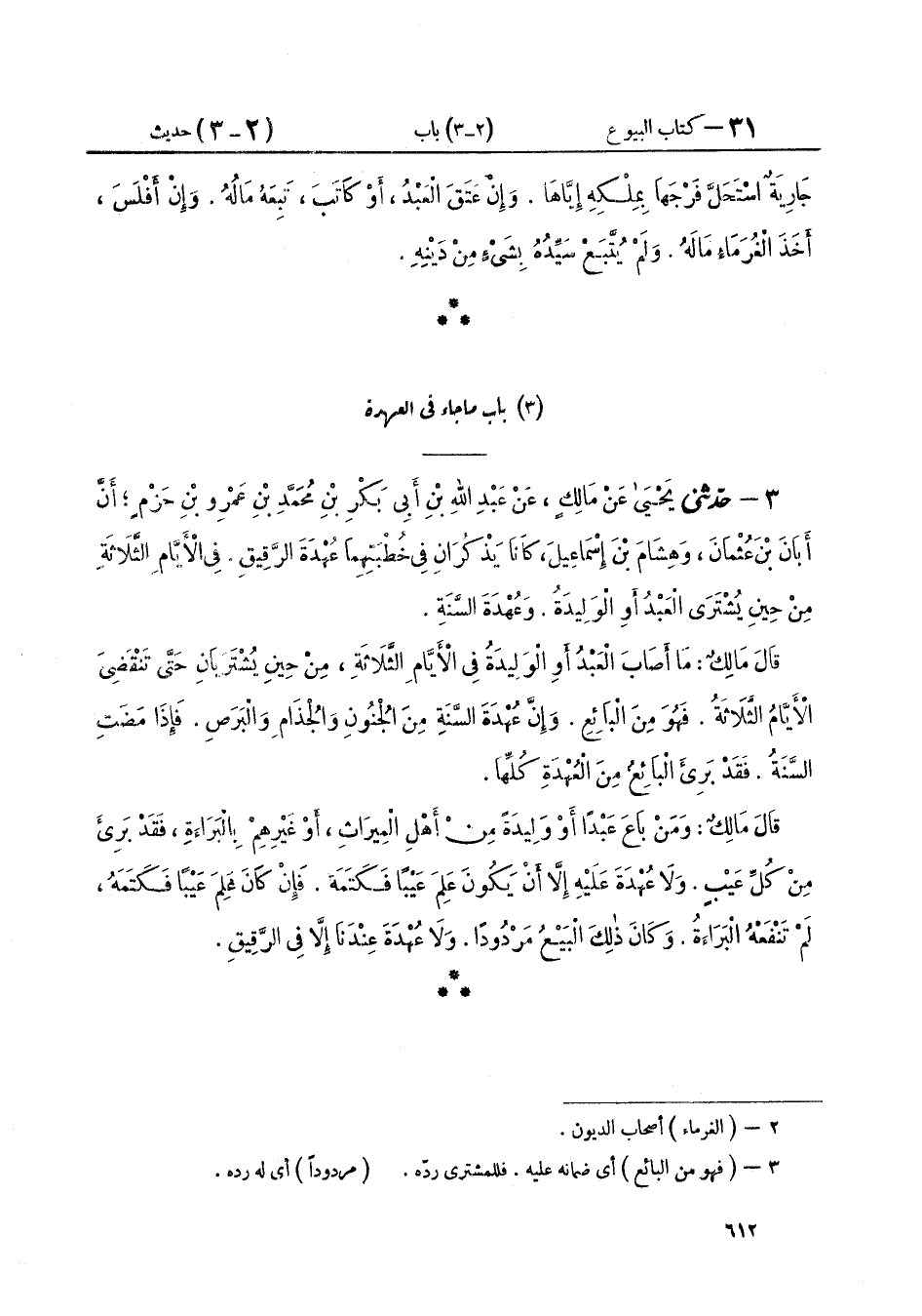 ٣ - حَدَّثَنِي يَحْيَى، عَنْ مَالِكٍ، عَنْ عَبْدِ اللَّهِ بْنِ أَبِي بَكْرِ بْنِ مُحَمَّدِ بْنِ عَمْرِو بْنِ حَزْمٍ، أَنَّ أَبَانَ بْنَ عُثْمَانَ وَهِشَامَ بْنَ إِسْمَاعِيلَ: «كَانَا يَذْكُرَانِ فِي خُطْبَتِهِمَا عُهْدَةَ الرَّقِيقِ فِي الْأَيَّامِ الثَّلَاثَةِ، مِنْ حِينِ يُشْتَرَى الْعَبْدُ أَوِ الْوَلِيدَةُ، وَعُهْدَةَ السَّنَةِ» قَالَ مَالِكٌ: «مَا أَصَابَ الْعَبْدُ أَوِ الْوَلِيدَةُ فِي الْأَيَّامِ الثَّلَاثَةِ، مِنْ حِينِ يُشْتَرَيَانِ حَتَّى تَنْقَضِيَ الْأَيَّامُ الثَّلَاثَةُ، فَهُوَ مِنَ الْبَائِعِ، وَإِنَّ عُهْدَةَ السَّنَةِ مِنَ الْجُنُونِ، وَالْجُذَامِ وَالْبَرَصِ، فَإِذَا مَضَتِ السَّنَةُ فَقَدْ بَرِئَ الْبَائِعُ مِنَ الْعُهْدَةِ كُلِّهَا» قَالَ مَالِكٌ: «وَمَنْ بَاعَ عَبْدًا أَوْ وَلِيدَةً مِنْ أَهْلِ الْمِيرَاثِ، أَوْ غَيْرِهِمْ بِالْبَرَاءَةِ، فَقَدْ بَرِئَ مِنْ كُلِّ عَيْبٍ، وَلَا عُهْدَةَ عَلَيْهِ إِلَّا أَنْ يَكُونَ عَلِمَ عَيْبًا فَكَتَمَهُ، فَإِنْ كَانَ عَلِمَ عَيْبًا فَكَتَمَهُ، لَمْ تَنْفَعْهُ الْبَرَاءَةُ، وَكَانَ ذَلِكَ الْبَيْعُ مَرْدُودًا، وَلَا عُهْدَةَ عِنْدَنَا إِلَّا فِي الرَّقِيقِ»