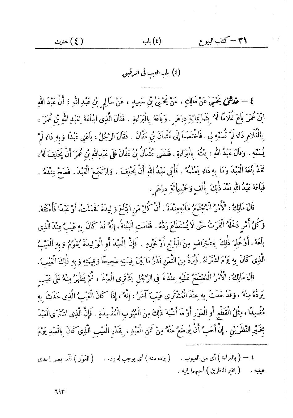 ٤ - حَدَّثَنِي يَحْيَى، عَنْ مَالِكٍ، عَنْ يَحْيَى بْنِ سَعِيدٍ، عَنْ سَالِمِ بْنِ عَبْدِ اللَّهِ، أَنَّ عَبْدَ اللَّهِ بْنَ عُمَرَ بَاعَ غُلَامًا لَهُ بِثَمَانِمِائَةِ دِرْهَمٍ، وَبَاعَهُ بِالْبَرَاءَةِ فَقَالَ الَّذِي ابْتَاعَهُ لِعَبْدِ اللَّهِ بْنِ عُمَرَ: بِالْغُلَامِ دَاءٌ لَمْ تُسَمِّهِ لِي، فَاخْتَصَمَا إِلَى عُثْمَانَ بْنِ عَفَّانَ، فَقَالَ الرَّجُلُ: بَاعَنِي عَبْدًا، وَبِهِ دَاءٌ لَمْ يُسَمِّهِ، وَقَالَ عَبْدُ اللَّهِ: «بِعْتُهُ بِالْبَرَاءَةِ»، فَقَضَى عُثْمَانُ بْنُ عَفَّانَ، عَلَى عَبْدِ اللَّهِ بْنِ عُمَرَ أَنْ يَحْلِفَ لَهُ لَقَدْ بَاعَهُ الْعَبْدَ، وَمَا بِهِ دَاءٌ يَعْلَمُهُ، فَأَبَى عَبْدُ اللَّهِ أَنْ يَحْلِفَ، وَارْتَجَعَ الْعَبْدَ، فَصَحَّ عِنْدَهُ، فَبَاعَهُ عَبْدُ اللَّهِ بَعْدَ ذَلِكَ بِأَلْفٍ وَخَمْسِمِائَةِ دِرْهَمٍ " قَالَ مَالِكٌ: «الْأَمْرُ الْمُجْتَمَعُ عَلَيْهِ عِنْدَنَا، أَنَّ كُلَّ مَنِ ابْتَاعَ وَلِيدَةً فَحَمَلَتْ، أَوْ عَبْدًا فَأَعْتَقَهُ. وَكُلَّ أَمْرٍ دَخَلَهُ الْفَوْتُ حَتَّى لَا يُسْتَطَاعَ رَدُّهُ، فَقَامَتِ الْبَيِّنَةُ، إِنَّهُ قَدْ كَانَ بِهِ عَيْبٌ عِنْدَ الَّذِي بَاعَهُ. أَوْ عُلِمَ ذَلِكَ بِاعْتِرَافٍ مِنَ الْبَائِعِ أَوْ غَيْرِهِ. فَإِنَّ الْعَبْدَ أَوِ الْوَلِيدَةَ يُقَوَّمُ وَبِهِ الْعَيْبُ الَّذِي كَانَ بِهِ يَوْمَ اشْتَرَاهُ. فَيُرَدُّ مِنَ الثَّمَنِ قَدْرُ مَا بَيْنَ قِيمَتِهِ صَحِيحًا وَقِيمَتِهِ وَبِهِ ذَلِكَ الْعَيْبُ» قَالَ مَالِكٌ: " الْأَمْرُ الْمُجْتَمَعُ عَلَيْهِ عِنْدَنَا فِي الرَّجُلِ يَشْتَرِي الْعَبْدَ، ثُمَّ يَظْهَرُ مِنْهُ عَلَى عَيْبٍ يَرُدُّهُ مِنْهُ، وَقَدْ حَدَثَ بِهِ عِنْدَ الْمُشْتَرِي عَيْبٌ آخَرُ: إِنَّهُ إِذَا كَانَ الْعَيْبُ الَّذِي حَدَثَ بِهِ مُفْسِدًا، مِثْلُ الْقَطْعِ أَوِ الْعَوَرِ أَوْ مَا أَشْبَهَ ذَلِكَ مِنَ الْعُيُوبِ الْمُفْسِدَةِ. فَإِنَّ الَّذِي اشْتَرَى الْعَبْدَ بِخَيْرِ النَّظَرَيْنِ. إِنْ أَحَبَّ أَنْ يُوضَعَ عَنْهُ مِنْ ثَمَنِ الْعَبْدِ، بِقَدْرِ الْعَيْبِ الَّذِي كَانَ بِالْعَبْدِ يَوْمَ ⦗٦١٤⦘ اشْتَرَاهُ، وُضِعَ عَنْهُ. وَإِنْ أَحَبَّ أَنْ يَغْرَمَ قَدْرَ مَا أَصَابَ الْعَبْدَ مِنَ الْعَيْبِ عِنْدَهُ، ثُمَّ يَرُدُّ الْعَبْدَ، فَذَلِكَ لَهُ. وَإِنْ مَاتَ الْعَبْدُ عِنْدَ الَّذِي اشْتَرَاهُ، أُقِيمَ الْعَبْدُ وَبِهِ الْعَيْبُ الَّذِي كَانَ بِهِ يَوْمَ اشْتَرَاهُ. فَيُنْظَرُ كَمْ ثَمَنُهُ؟ فَإِنْ كَانَتْ قِيمَةُ الْعَبْدِ يَوْمَ اشْتَرَاهُ بِغَيْرِ عَيْبٍ، مِائَةَ دِينَارٍ. وَقِيمَتُهُ يَوْمَ اشْتَرَاهُ وَبِهِ الْعَيْبُ، ثَمَانُونَ دِينَارًا وُضِعَ عَنِ الْمُشْتَرِي مَا بَيْنَ الْقِيمَتَيْنِ. وَإِنَّمَا تَكُونُ الْقِيمَةُ يَوْمَ اشْتُرِيَ الْعَبْدُ " قَالَ مَالِكٌ: " الْأَمْرُ الْمُجْتَمَعُ عَلَيْهِ عِنْدَنَا، أَنَّ مَنْ رَدَّ وَلِيدَةً مِنْ عَيْبٍ وَجَدَهُ بِهَا، وَكَانَ قَدْ أَصَابَهَا: أَنَّهَا إِنْ كَانَتْ بِكْرًا فَعَلَيْهِ مَا نَقَصَ مِنْ ثَمَنِهَا، وَإِنْ كَانَتْ ثَيِّبًا فَلَيْسَ عَلَيْهِ فِي إِصَابَتِهِ إِيَّاهَا شَيْءٌ، لِأَنَّهُ كَانَ ضَامِنًا لَهَا " قَالَ مَالِكٌ: «الْأَمْرُ الْمُجْتَمَعُ عَلَيْهِ عِنْدَنَا، فِيمَنْ بَاعَ عَبْدًا أَوْ وَلِيدَةً أَوْ حَيَوَانًا بِالْبَرَاءَةِ، مِنْ أَهْلِ الْمِيرَاثِ أَوْ غَيْرِهِمْ. فَقَدْ بَرِئَ مِنْ كُلِّ عَيْبٍ فِيمَا بَاعَ، إِلَّا أَنْ يَكُونَ عَلِمَ فِي ذَلِكَ عَيْبًا فَكَتَمَهُ. فَإِنْ كَانَ عَلِمَ عَيْبًا فَكَتَمَهُ. لَمْ تَنْفَعْهُ تَبْرِئَتُهُ. وَكَانَ مَا بَاعَ مَرْدُودًا عَلَيْهِ» قَالَ مَالِكٌ: فِي الْجَارِيَةِ تُبَاعُ بِالْجَارِيتَيْنِ، ثُمَّ يُوجَدُ بِإِحْدَى الْجَارِيَتَيْنِ عَيْبٌ تُرَدُّ مِنْهُ. ق
