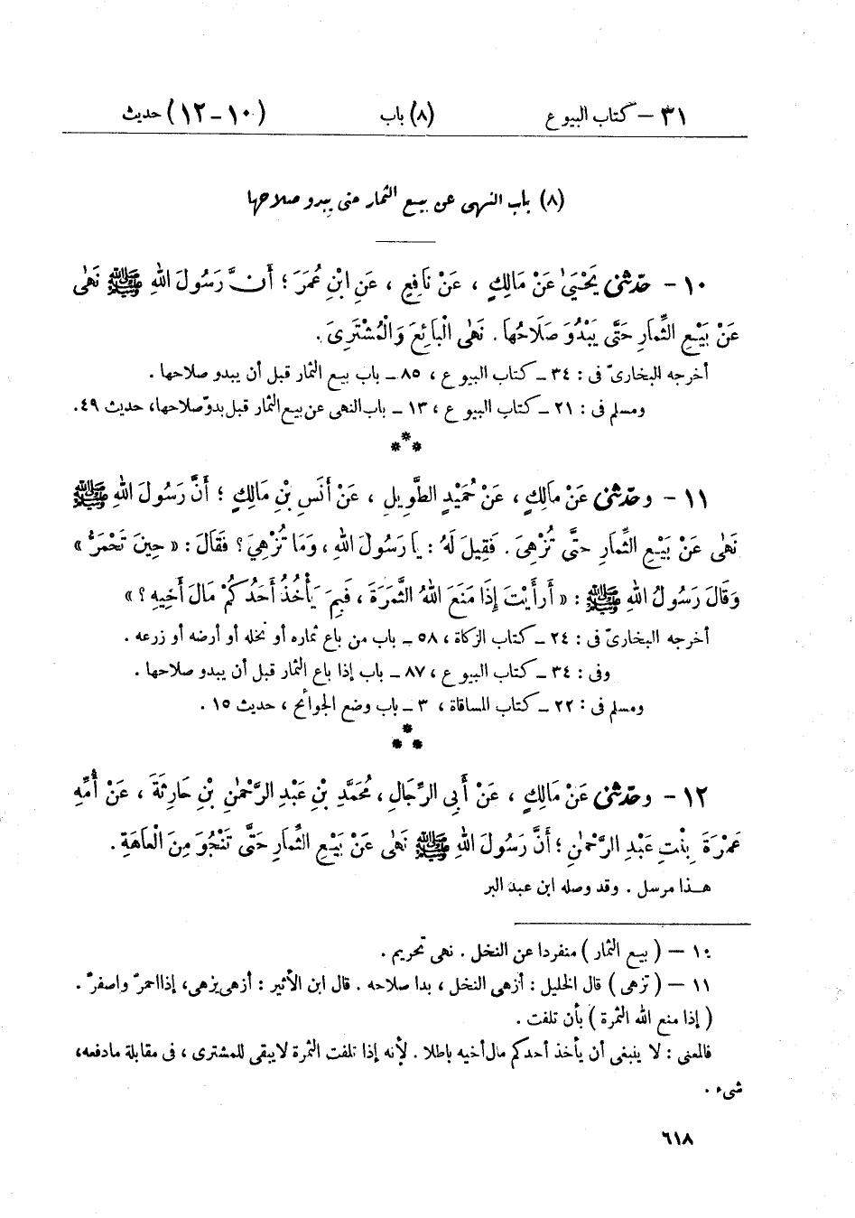 ١٢ - وَحَدَّثَنِي عَنْ مَالِكٍ، عَنْ أَبِي الرِّجَالِ مُحَمَّدِ بْنِ عَبْدِ الرَّحْمَنِ بْنِ حَارِثَةَ، عَنْ أُمِّهِ عَمْرَةَ بِنْتِ عَبْدِ الرَّحْمَنِ، أَنَّ رَسُولَ اللَّهِ صَلَّى اللهُ عَلَيْهِ وَسَلَّمَ: «نَهَى عَنْ بَيْعِ الثِّمَارِ حَتَّى تَنْجُوَ مِنَ الْعَاهَةِ» ⦗٦١٩⦘ قَالَ مَالِكٌ: «وَبَيْعُ الثِّمَارِ قَبْلَ أَنْ يَبْدُوَ صَلَاحُهَا مِنْ بَيْعِ الْغَرَرِ»