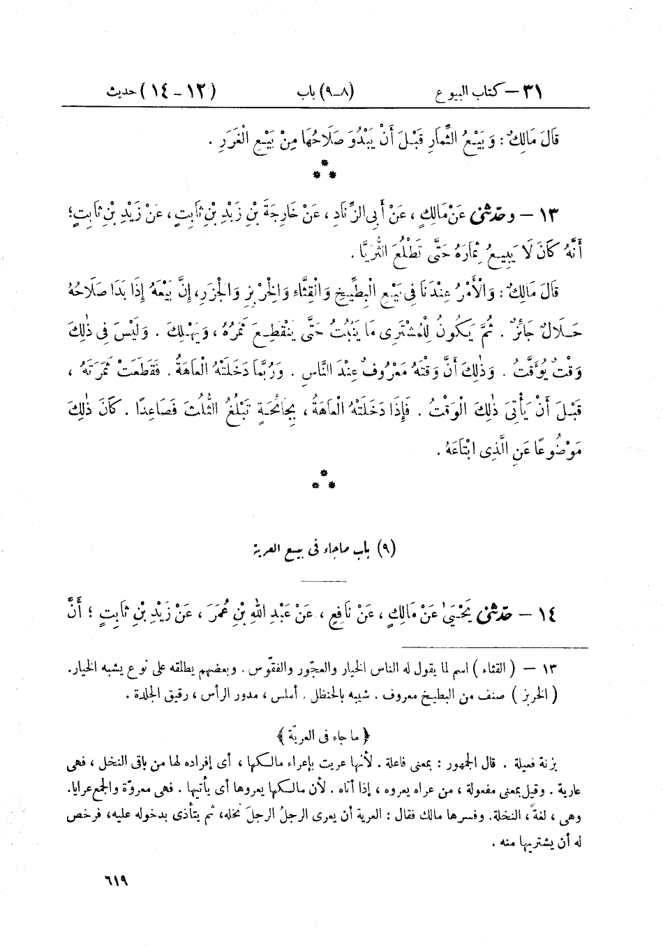 ١٣ - وَحَدَّثَنِي عَنْ مَالِكٍ، عَنْ أَبِي الزِّنَادِ، عَنْ خَارِجَةَ بْنِ زَيْدِ بْنِ ثَابِتٍ، عَنْ زَيْدِ بْنِ ثَابِتٍ أَنَّهُ كَانَ «لَا يَبِيعُ ثِمَارَهُ حَتَّى تَطْلُعَ الثُّرَيَّا» قَالَ مَالِكٌ: وَالْأَمْرُ عِنْدَنَا فِي بَيْعِ الْبِطِّيخِ، وَالْقِثَّاءِ، وَالْخِرْبِزِ، وَالْجَزَرِ، إِنَّ بَيْعَهُ إِذَا بَدَا صَلَاحُهُ حَلَالٌ جَائِزٌ، ثُمَّ يَكُونُ لِلْمُشْتَرِي مَا يَنْبُتُ حَتَّى يَنْقَطِعَ ثَمَرُهُ، وَيَهْلِكَ وَلَيْسَ فِي ذَلِكَ وَقْتٌ يُؤَقَّتُ، وَذَلِكَ أَنَّ وَقْتَهُ مَعْرُوفٌ عِنْدَ النَّاسِ، وَرُبَّمَا دَخَلَتْهُ الْعَاهَةُ، فَقَطَعَتْ ثَمَرَتَهُ، قَبْلَ أَنْ يَأْتِيَ ذَلِكَ الْوَقْتُ، فَإِذَا دَخَلَتْهُ الْعَاهَةُ بِجَائِحَةٍ تَبْلُغُ الثُّلُثَ فَصَاعِدًا كَانَ ذَلِكَ مَوْضُوعًا عَنِ الَّذِي ابْتَاعَهُ "