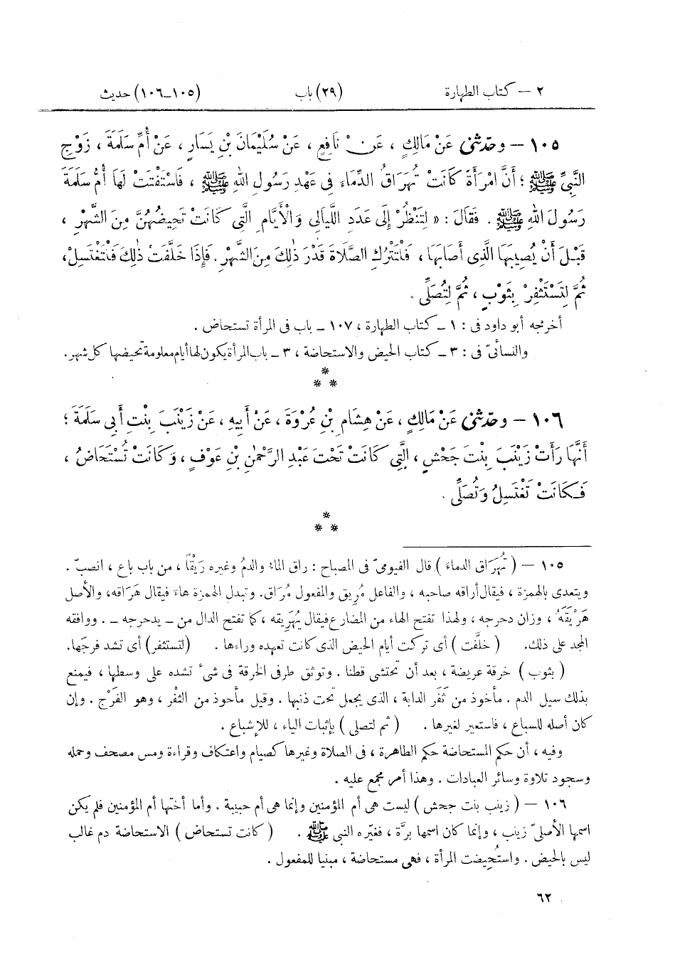 ١٠٦ - وَحَدَّثَنِي عَنْ مَالِكٍ، عَنْ هِشَامِ بْنِ عُرْوَةَ، عَنْ أَبِيهِ، عَنْ زَيْنَبَ بِنْتِ أَبِي سَلَمَةَ، أَنَّهَا رَأَتْ زَيْنَبَ بِنْتَ جَحْشٍ الَّتِي كَانَتْ تَحْتَ عَبْدِ الرَّحْمَنِ بْنِ عَوْفٍ وَكَانَتْ تُسْتَحَاضُ فَكَانَتْ «تَغْتَسِلُ وَتُصَلِّي»