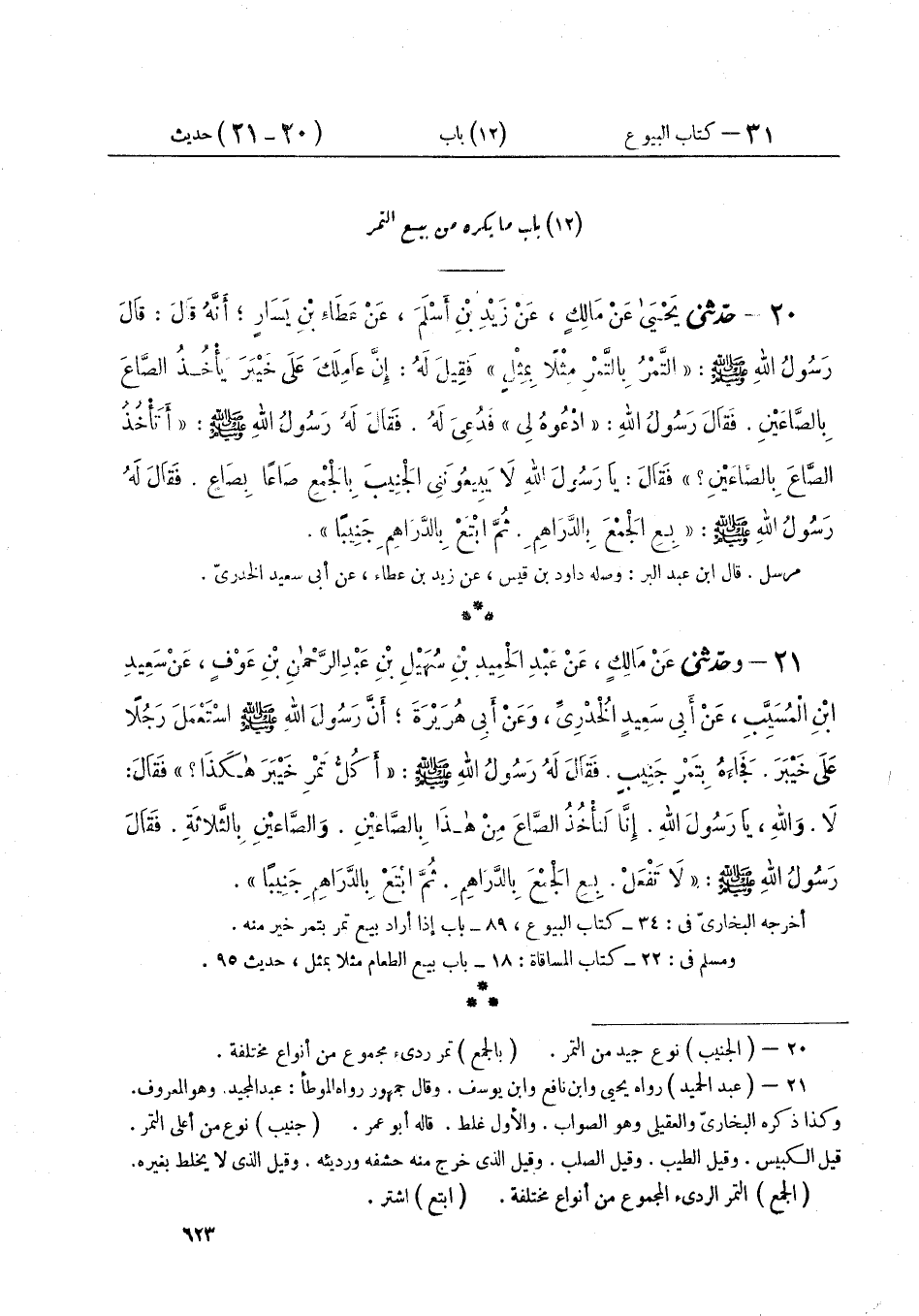 ٢١ - وَحَدَّثَنِي عَنْ مَالِكٍ، عَنْ عَبْدِ الْمَجِيدِ بْنِ سُهَيْلِ بْنِ عَبْدِ الرَّحْمَنِ بْنِ عَوْفٍ، عَنْ سَعِيدِ بْنِ الْمُسَيِّبِ، عَنْ أَبِي سَعِيدٍ الْخُدْرِيِّ، وَعَنْ أَبِي هُرَيْرَةَ أَنَّ رَسُولَ اللَّهِ صَلَّى اللهُ عَلَيْهِ وَسَلَّمَ اسْتَعْمَلَ رَجُلًا عَلَى خَيْبَرَ، فَجَاءَهُ بِتَمْرٍ جَنِيبٍ، فَقَالَ لَهُ رَسُولُ اللَّهِ صَلَّى اللهُ عَلَيْهِ وَسَلَّمَ: «أَكُلُّ تَمْرِ خَيْبَرَ هَكَذَا»؟ فَقَالَ: لَا وَاللَّهِ يَا رَسُولَ اللَّهِ، إِنَّا لَنَأْخُذُ الصَّاعَ مِنْ هَذَا بِالصَّاعَيْنِ وَالصَّاعَيْنِ بِالثَّلَاثَةِ، فَقَالَ رَسُولُ اللَّهِ صَلَّى اللهُ عَلَيْهِ وَسَلَّمَ: لَا تَفْعَلْ «بِعِ الْجَمْعَ بِالدَّرَاهِمِ، ثُمَّ ابْتَعْ بِالدَّرَاهِمِ جَنِيبًا»