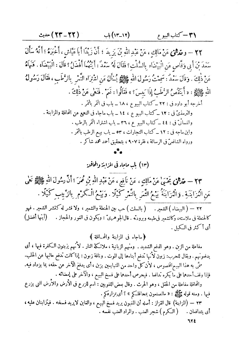 ٢٣ - حَدَّثَنِي يَحْيَى، عَنْ مَالِكٍ عَنْ نَافِعٍ، عَنْ عَبْدِ اللَّهِ بْنِ عُمَرَ أَنَّ رَسُولَ اللَّهِ صَلَّى اللهُ عَلَيْهِ وَسَلَّمَ: «نَهَى عَنِ الْمُزَابَنَةِ»، وَالْمُزَابَنَةُ: بَيْعُ الثَّمَرِ بِالتَّمْرِ كَيْلًا، وَبَيْعُ الْكَرْمِ بِالزَّبِيبِ كَيْلًا