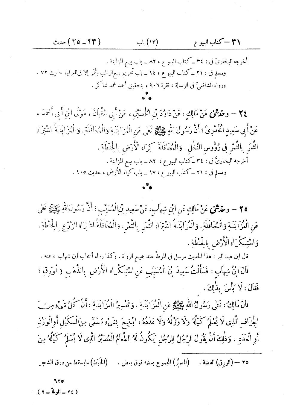 ٢٥ - وَحَدَّثَنِي عَنْ مَالِكٍ، عَنِ ابْنِ شِهَابٍ، عَنْ سَعِيدِ بْنِ الْمُسَيِّبِ، أَنَّ رَسُولَ اللَّهِ صَلَّى اللهُ عَلَيْهِ وَسَلَّمَ «نَهَى عَنِ الْمُزَابَنَةِ وَالْمُحَاقَلَةِ»، وَالْمُزَابَنَةُ اشْتِرَاءُ الثَّمَرِ بِالتَّمْرِ، وَالْمُحَاقَلَةُ اشْتِرَاءُ الزَّرْعِ بِالْحِنْطَةِ، وَاسْتِكْرَاءُ الْأَرْضِ بِالْحِنْطَةِ "