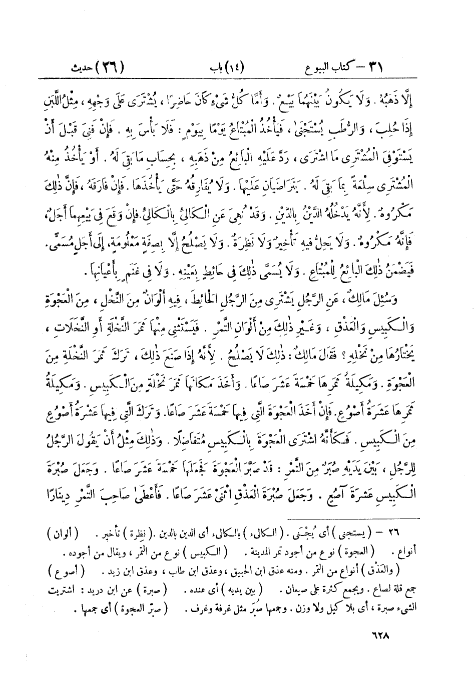 إِلَّا ذَهَبُهُ، وَلَا يَكُونُ بَيْنَهُمَا بَيْعٌ، وَأَمَّا كُلُّ شَيْءٍ كَانَ حَاضِرًا يُشْتَرَى عَلَى وَجْهِهِ مِثْلُ اللَّبَنِ إِذَا حُلِبَ، وَالرُّطَبِ يُسْتَجْنَى، فَيَأْخُذُ الْمُبْتَاعُ يَوْمًا بِيَوْمٍ، فَلَا بَأْسَ بِهِ، فَإِنْ فَنِيَ قَبْلَ أَنْ يَسْتَوْفِيَ الْمُشْتَرِي مَا اشْتَرَى رَدَّ عَلَيْهِ الْبَائِعُ مِنْ ذَهَبِهِ بِحِسَابِ مَا بَقِيَ لَهُ، أَوْ يَأْخُذُ مِنْهُ الْمُشْتَرِي سِلْعَةً، بِمَا بَقِيَ لَهُ يَتَرَاضَيَانِ عَلَيْهَا، وَلَا يُفَارِقُهُ حَتَّى يَأْخُذَهَا، فَإِنْ فَارَقَهُ، فَإِنَّ ذَلِكَ مَكْرُوهٌ لِأَنَّهُ يَدْخُلُهُ الدَّيْنُ بِالدَّيْنِ، وَقَدْ نُهِيَ عَنِ الْكَالِئِ بِالْكَالِئِ، فَإِنْ وَقَعَ فِي بَيْعِهِمَا أَجَلٌ فَإِنَّهُ مَكْرُوهٌ وَلَا يَحِلُّ فِيهِ تَأْخِيرٌ وَلَا نَظِرَةٌ، وَلَا يَصْلُحُ إِلَّا بِصِفَةٍ مَعْلُومَةٍ إِلَى أَجَلٍ مُسَمًّى، فَيَضْمَنُ ذَلِكَ الْبَائِعُ لِلْمُبْتَاعِ، وَلَا يُسَمَّى ذَلِكَ فِي حَائِطٍ بِعَيْنِهِ، وَلَا فِي غَنَمٍ بِأَعْيَانِهَا " وَسُئِلَ مَالِكٌ عَنِ الرَّجُلِ يَشْتَرِي مِنَ الرَّجُلِ الْحَائِطَ فِيهِ أَلْوَانٌ مِنَ النَّخْلِ مِنَ الْعَجْوَةِ وَالْكَبِيسِ وَالْعَذْقِ، وَغَيْرِ ذَلِكَ مِنْ أَلْوَانِ التَّمْرِ، فَيَسْتَثْنِي مِنْهَا ثَمَرَ النَّخْلَةِ أَوِ النَّخَلَاتِ يَخْتَارُهَا مِنْ نَخْلِهِ؟ فَقَالَ مَالِكٌ: " ذَلِكَ لَا يَصْلُحُ لِأَنَّهُ إِذَا صَنَعَ ذَلِكَ تَرَكَ ثَمَرَ النَّخْلَةِ مِنَ الْعَجْوَةِ، وَمَكِيلَةُ ثَمَرِهَا خَمْسَةَ عَشَرَ صَاعًا وَأَخَذَ مَكَانَهَا ثَمَرَ نَخْلَةٍ مِنَ الْكَبِيسِ، وَمَكِيلَةُ ثَمَرِهَا عَشَرَةُ أَصْوُعٍ، فَإِنْ أَخَذَ الْعَجْوَةَ الَّتِي فِيهَا خَمْسَةَ عَشَرَ صَاعًا، وَتَرَكَ الَّتِي فِيهَا عَشْرَةُ أَصْوُعٍ مِنَ الْكَبِيسِ فَكَأَنَّهُ اشْتَرَى الْعَجْوَةَ بِالْكَبِيسِ مُتَفَاضِلًا، وَذَلِكَ مِثْلُ أَنْ يَقُولَ الرَّجُلُ لِلرَّجُلِ بَيْنَ يَدَيْهِ صُبَرٌ مِنَ التَّمْرِ قَدْ صَبَّرَ الْعَجْوَةَ، فَجَعَلَهَا خَمْسَةَ عَشَرَ صَاعًا، وَجَعَلَ صُبْرَةَ الْكَبِيسِ عَشَرَةَ آصُعٍ، وَجَعَلَ صُبْرَةَ الْعَذْقِ اثْنَيْ عَشَرَ صَاعًا، فَأَعْطَى صَاحِبَ التَّمْرِ دِينَارًا