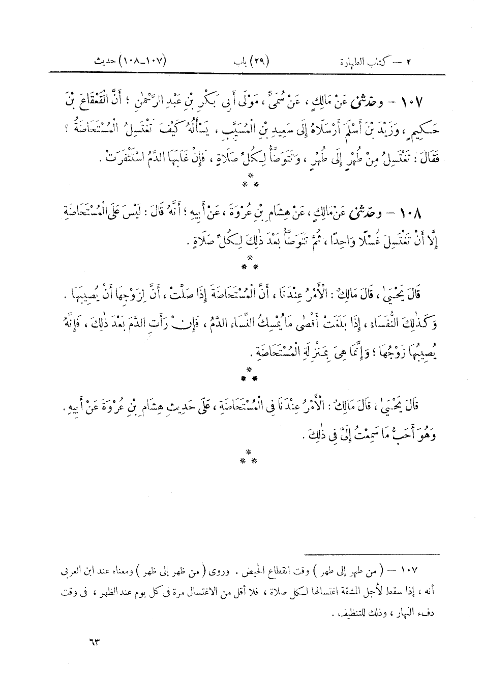 ١٠٨ - وَحَدَّثَنِي عَنْ مَالِكٍ، عَنْ هِشَامِ بْنِ عُرْوَةَ، عَنْ أَبِيهِ، أَنَّهُ قَالَ: «لَيْسَ عَلَى الْمُسْتَحَاضَةِ إِلَّا أَنْ تَغْتَسِلَ غُسْلًا وَاحِدًا، ثُمَّ تَتَوَضَّأُ بَعْدَ ذَلِكَ لِكُلِّ صَلَاةٍ» قَالَ يَحْيَى: قَالَ مَالِكٌ: «الْأَمْرُ عِنْدَنَا أَنَّ الْمُسْتَحَاضَةَ إِذَا صَلَّتْ، أَنَّ لِزَوْجِهَا أَنْ يُصِيبَهَا وَكَذَلِكَ النُّفَسَاءُ إِذَا بَلَغَتْ أَقْصَى مَا يُمْسِكُ النِّسَاءَ الدَّمُ، فَإِنْ رَأَتِ الدَّمَ بَعْدَ ذَلِكَ، فَإِنَّهُ يُصِيبُهَا زَوْجُهَا وَإِنَّمَا هِيَ بِمَنْزِلَةِ الْمُسْتَحَاضَةِ» قَالَ يَحْيَى: قَالَ مَالِكٌ: «الْأَمْرُ عِنْدَنَا فِي الْمُسْتَحَاضَةِ عَلَى حَدِيثِ هِشَامِ بْنِ عُرْوَةَ عَنْ أَبِيهِ وَهُوَ أَحَبُّ مَا سَمِعْتُ إِلَيَّ فِي ذَلِكَ»