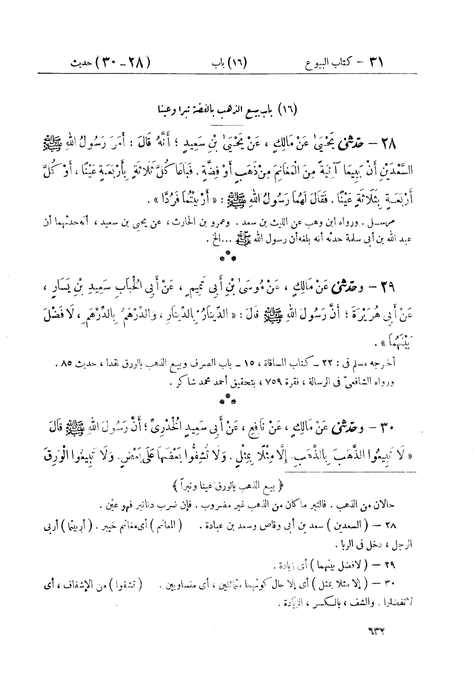 ٣٠ - وَحَدَّثَنِي عَنْ مَالِكٍ عَنْ نَافِعٍ، عَنْ أَبِي سَعِيدٍ الْخُدْرِيِّ أَنَّ رَسُولَ اللَّهِ صَلَّى اللهُ عَلَيْهِ وَسَلَّمَ قَالَ: «لَا تَبِيعُوا الذَّهَبَ بِالذَّهَبِ إِلَّا مِثْلًا بِمِثْلٍ، وَلَا تُشِفُّوا بَعْضَهَا عَلَى بَعْضٍ، وَلَا تَبِيعُوا الْوَرِقَ ⦗٦٣٣⦘ بِالْوَرِقِ إِلَّا مِثْلًا بِمِثْلٍ، وَلَا تُشِفُّوا بَعْضَهَا عَلَى بَعْضٍ، وَلَا تَبِيعُوا مِنْهَا شَيْئًا غَائِبًا بِنَاجِزٍ»