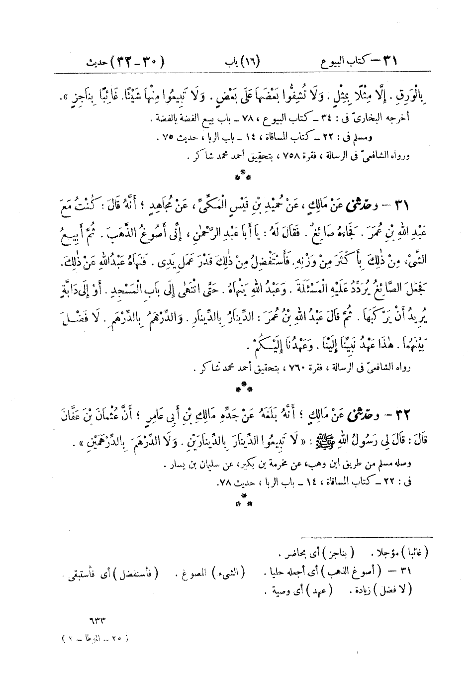 ٣١ - وَحَدَّثَنِي عَنْ مَالِكٍ، عَنْ حُمَيْدِ بْنِ قَيْسٍ الْمَكِّيِّ، عَنْ مُجَاهِدٍ، أَنَّهُ قَالَ كُنْتُ مَعَ عَبْدِ اللَّهِ بْنِ عُمَرَ فَجَاءَهُ صَائِغٌ، فَقَالَ لَهُ يَا أَبَا عَبْدِ الرَّحْمَنِ، إِنِّي أَصُوغُ الذَّهَبَ ثُمَّ أَبِيعُ الشَّيْءَ مِنْ ذَلِكَ بِأَكْثَرَ مِنْ وَزْنِهِ، فَأَسْتَفْضِلُ مِنْ ذَلِكَ قَدْرَ عَمَلِ يَدِي، فَنَهَاهُ عَبْدُ اللَّهِ عَنْ ذَلِكَ فَجَعَلَ الصَّائِغُ يُرَدِّدُ عَلَيْهِ الْمَسْأَلَةَ، وَعَبْدُ اللَّهِ يَنْهَاهُ حَتَّى انْتَهَى إِلَى بَابِ الْمَسْجِدِ أَوْ إِلَى دَابَّةٍ يُرِيدُ أَنْ يَرْكَبَهَا، ثُمَّ قَالَ عَبْدُ اللَّهِ بْنُ عُمَرَ: «الدِّينَارُ بِالدِّينَارِ، وَالدِّرْهَمُ بِالدِّرْهَمِ لَا فَضْلَ بَيْنَهُمَا، هَذَا عَهْدُ نَبِيِّنَا إِلَيْنَا وَعَهْدُنَا إِلَيْكُمْ»
