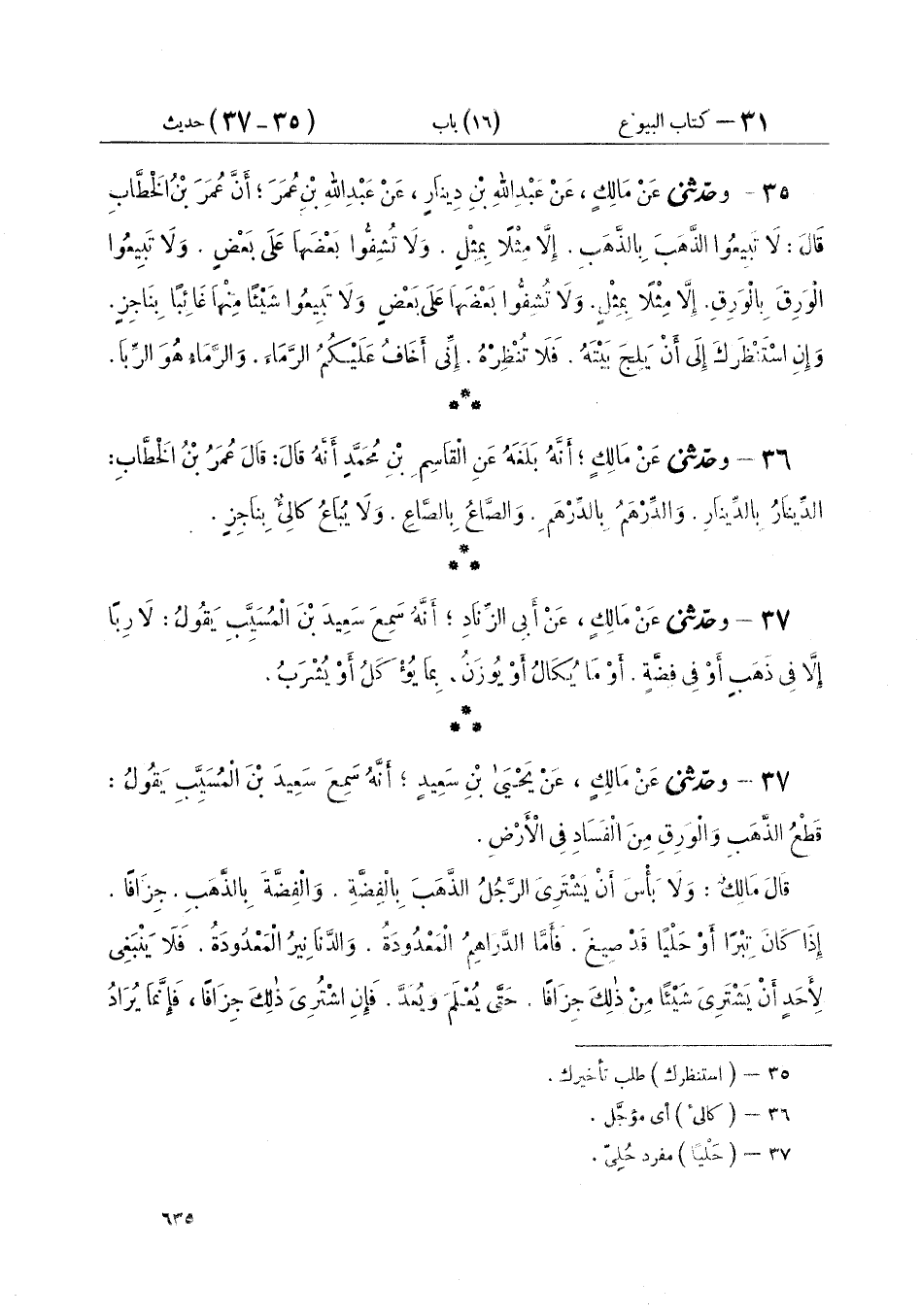٣٧ - وَحَدَّثَنِي عَنْ مَالِكٍ، عَنْ أَبِي الزِّنَادِ، أَنَّهُ سَمِعَ سَعِيدَ بْنَ الْمُسَيِّبِ يَقُولُ: «لَا رِبًا إِلَّا فِي ذَهَبٍ أَوْ فِي فِضَّةٍ، أَوْ مَا يُكَالُ أَوْ يُوزَنُ بِمَا يُؤْكَلُ أَوْ يُشْرَبُ»