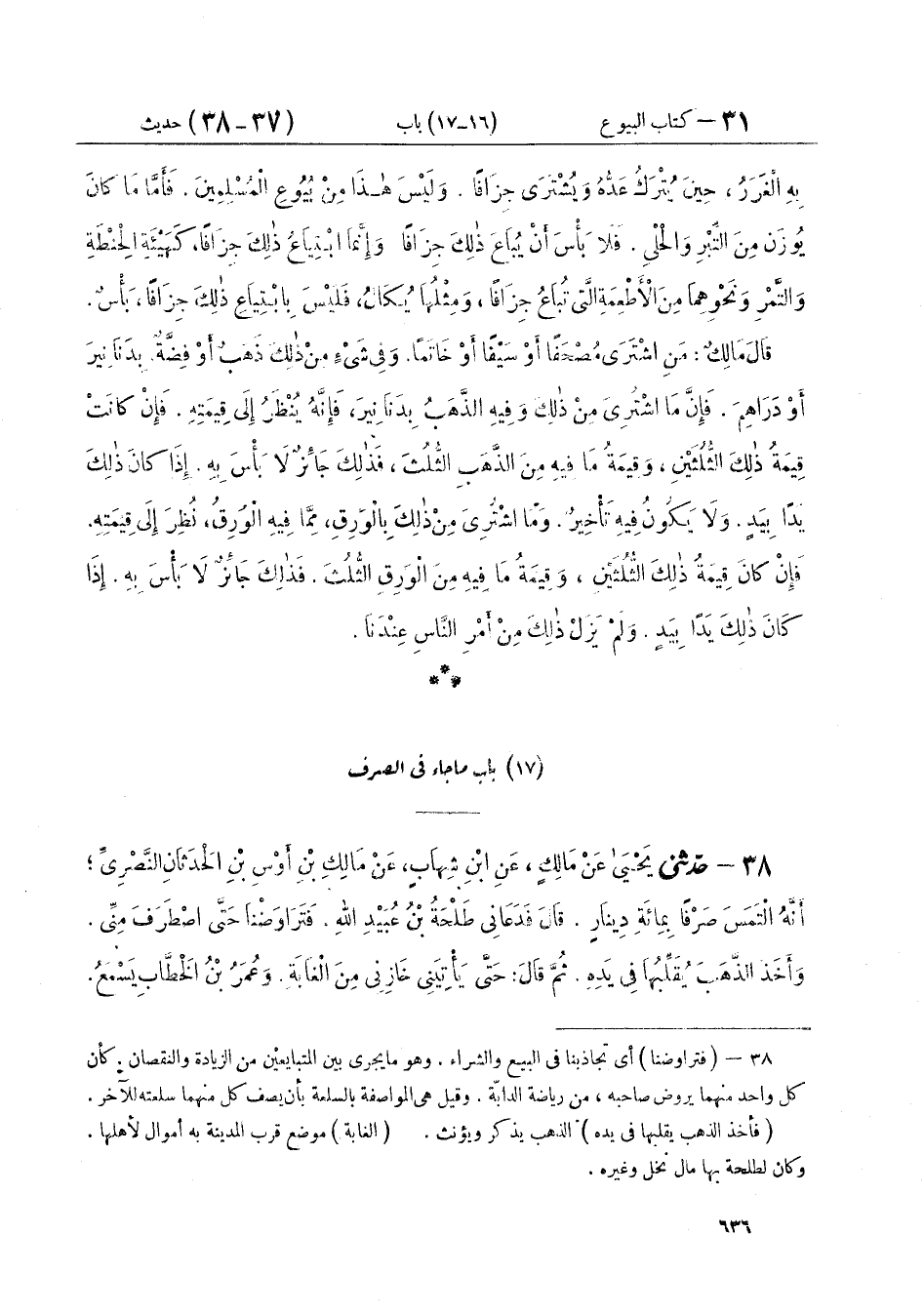 ٣٨ - حَدَّثَنِي يَحْيَى، عَنْ مَالِكٍ، عَنْ ابْنِ شِهَابٍ، عَنْ مَالِكِ بْنِ أَوْسِ بْنِ الْحَدَثَانِ النَّصْرِيِّ أَنَّهُ الْتَمَسَ صَرْفًا بِمِائَةِ دِينَارٍ، قَالَ فَدَعَانِي طَلْحَةُ بْنُ عُبَيْدِ اللَّهِ فَتَرَاوَضْنَا حَتَّى اصْطَرَفَ مِنِّي وَأَخَذَ الذَّهَبَ يُقَلِّبُهَا فِي يَدِهِ، ثُمَّ قَالَ: حَتَّى يَأْتِيَنِي خَازِنِي مِنَ الْغَابَةِ وَعُمَرُ بْنُ الْخَطَّابِ يَسْمَعُ، ⦗٦٣٧⦘ فَقَالَ عُمَرُ: وَاللَّهِ لَا تُفَارِقْهُ حَتَّى تَأْخُذَ مِنْهُ، ثُمَّ قَالَ: قَالَ رَسُولُ اللَّهِ صَلَّى اللهُ عَلَيْهِ وَسَلَّمَ: «الذَّهَبُ بِالْوَرِقِ رِبًا، إِلَّا هَاءَ وَهَاءَ، وَالْبُرُّ بِالْبُرِّ رِبًا، إِلَّا هَاءَ وَهَاءَ، وَالتَّمْرُ بِالتَّمْرِ رِبًا، إِلَّا هَاءَ وَهَاءَ، وَالشَّعِيرُ بِالشَّعِيرِ رِبًا، إِلَّا هَاءَ وَهَاءَ» قَالَ مَالِكٌ: إِذَا اصْطَرَفَ الرَّجُلُ دَرَاهِمَ بِدَنَانِيرَ، ثُمَّ وَجَدَ فِيهَا دِرْهَمًا زَائِفًا، فَأَرَادَ رَدَّهُ انْتَقَضَ صَرْفُ الدِّينَارِ، وَرَدَّ إِلَيْهِ وَرِقَهُ، وَأَخَذَ إِلَيْهِ دِينَارَهُ، وَتَفْسِيرُ مَا كُرِهَ مِنْ ذَلِكَ أَنَّ رَسُولَ اللَّهِ صَلَّى اللهُ عَلَيْهِ وَسَلَّمَ قَالَ: «الذَّهَبُ بِالْوَرِقِ رِبًا، إِلَّا هَاءَ وَهَاءَ» وَقَالَ عُمَرُ بْنُ الْخَطَّابِ: «وَإِنِ اسْتَنْظَرَكَ إِلَى أَنْ يَلِجَ بَيْتَهُ، فَلَا تُنْظِرْهُ وَهُوَ إِذَا رَدَّ عَلَيْهِ دِرْهَمًا مِنْ صَرْفٍ بَعْدَ أَنْ يُفَارِقَهُ كَانَ بِمَنْزِلَةِ الدَّيْنِ أَوِ الشَّيْءِ الْمُتَأَخِّرِ، فَلِذَلِكَ كُرِهَ ذَلِكَ، وَانْتَقَضَ الصَّرْفُ، وَإِنَّمَا أَرَادَ عُمَرُ بْنُ الْخَطَّابِ أَنْ لَا يُبَاعَ الذَّهَبُ وَالْوَرِقُ، وَالطَّعَامُ كُلُّهُ عَاجِلًا بِآجِلٍ، فَإِنَّهُ لَا يَنْبَغِي أَنْ يَكُونَ فِي شَيْءٍ مِنْ ذَلِكَ تَأْخِيرٌ، وَلَا نَظِرَةٌ وَإِنْ كَانَ مِنْ صِنْفٍ وَاحِدٍ أَوْ كَانَ مُخْتَلِفَةً أَصْنَافُهُ»