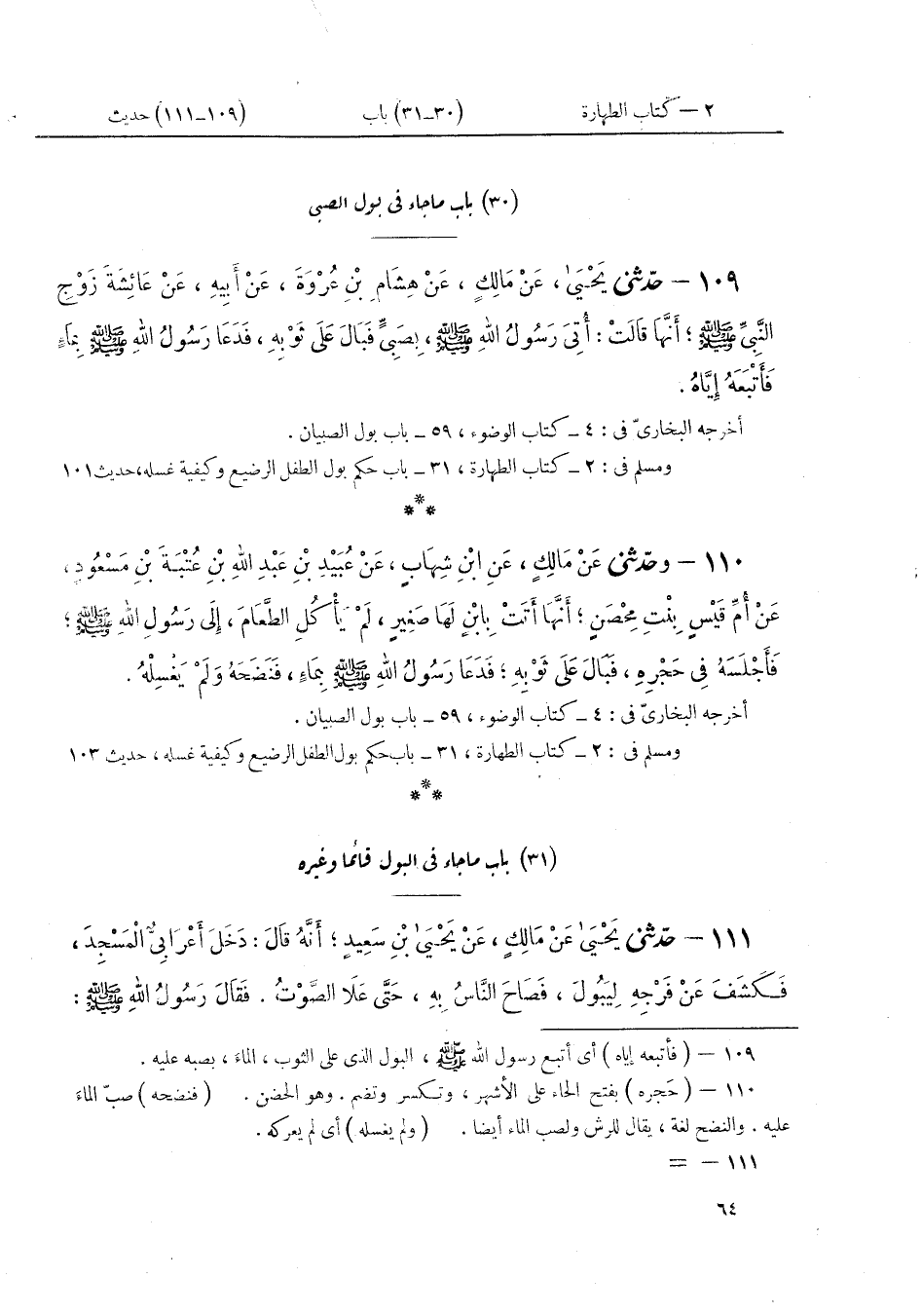 ١١٠ - وَحَدَّثَنِي عَنْ مَالِكٍ، عَنْ ابْنِ شِهَابٍ، عَنْ عُبَيْدِ اللَّهِ بْنِ عَبْدِ اللَّهِ بْنِ عُتْبَةَ بْنِ مَسْعُودٍ عَنْ أُمِّ قَيْسٍ بِنْتِ مِحْصَنٍ، أَنَّهَا أَتَتْ بِابْنٍ لَهَا صَغِيرٍ، لَمْ يَأْكُلِ الطَّعَامَ، إِلَى رَسُولِ اللَّهِ صَلَّى اللهُ عَلَيْهِ وَسَلَّمَ، فَأَجْلَسَهُ فِي حَجْرِهِ فَبَالَ عَلَى ثَوْبِهِ، «فَدَعَا رَسُولُ اللَّهِ بِمَاءٍ فَنَضَحَهُ وَلَمْ يَغْسِلْهُ»