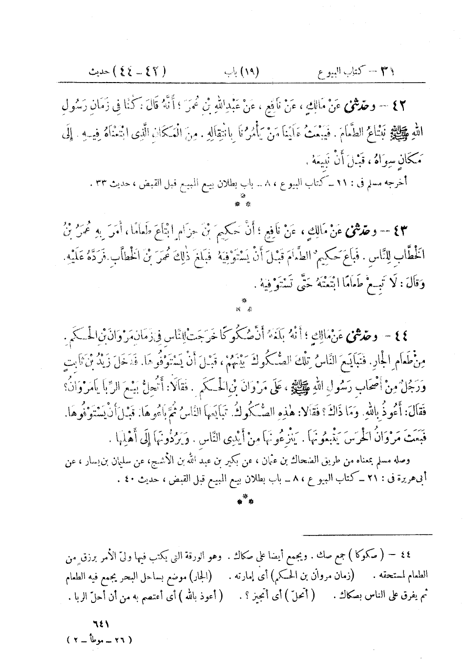 ٤٤ - وَحَدَّثَنِي عَنْ مَالِكٍ أَنَّهُ بَلَغَهُ، أَنَّ صُكُوكًا خَرَجَتْ لِلنَّاسِ فِي زَمَانِ مَرْوَانَ بْنِ الْحَكَمِ مِنْ طَعَامِ الْجَارِ، فَتَبَايَعَ النَّاسُ تِلْكَ الصُّكُوكَ بَيْنَهُمْ قَبْلَ أَنْ يَسْتَوْفُوهَا، فَدَخَلَ زَيْدُ بْنُ ثَابِتٍ، وَرَجُلٌ مِنْ أَصْحَابِ رَسُولِ اللَّهِ صَلَّى اللهُ عَلَيْهِ وَسَلَّمَ عَلَى مَرْوَانَ بْنِ الْحَكَمِ، فَقَالَ: " أَتُحِلُّ بَيْعَ الرِّبَا يَا مَرْوَانُ؟ فَقَالَ: أَعُوذُ بِاللَّهِ، وَمَا ذَاكَ؟ فقَالَ: هَذِهِ الصُّكُوكُ تَبَايَعَهَا النَّاسُ، ثُمَّ بَاعُوهَا، قَبْلَ أَنْ يَسْتَوْفُوهَا، فَبَعَثَ مَرْوَانُ الْحَرَسَ يَتْبَعُونَهَا، يَنْزِعُونَهَا مِنْ أَيْدِي النَّاسِ، وَيَرُدُّونَهَا إِلَى أَهْلِهَا "