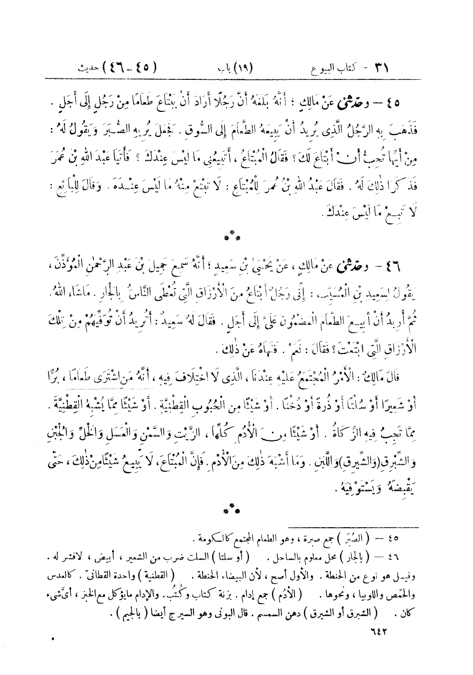 ٤٦ - وَحَدَّثَنِي عَنْ مَالِكٍ، عَنْ يَحْيَى بْنِ سَعِيدٍ، أَنَّهُ سَمِعَ جَمِيلَ بْنَ عَبْدِ الرَّحْمَنِ الْمُؤَذِّنَ يَقُولُ لِسَعِيدِ بْنِ الْمُسَيِّبِ: إِنِّي رَجُلٌ أَبْتَاعُ مِنَ الْأَرْزَاقِ الَّتِي تُعْطَى النَّاسُ بِالْجَارِ مَا شَاءَ اللَّهُ، ثُمَّ أُرِيدُ أَنْ أَبِيعَ الطَّعَامَ الْمَضْمُونَ عَلَيَّ إِلَى أَجَلٍ، فَقَالَ لَهُ سَعِيدٌ: «أَتُرِيدُ أَنْ تُوَفِّيَهُمْ مِنْ تِلْكَ الْأَرْزَاقِ الَّتِي ابْتَعْتَ»؟ فَقَالَ: نَعَمْ، «فَنَهَاهُ عَنْ ذَلِكَ» قَالَ مَالِكٌ: الْأَمْرُ الْمُجْتَمَعُ عَلَيْهِ عِنْدَنَا، الَّذِي لَا اخْتِلَافَ فِيهِ، أَنَّهُ مَنِ اشْتَرَى طَعَامًا بُرًّا أَوْ شَعِيرًا، أَوْ سُلْتًا أَوْ ذُرَةً، أَوْ دُخْنًا أَوْ شَيْئًا مِنَ الْحُبُوبِ الْقِطْنِيَّةِ، أَوْ شَيْئًا مِمَّا يُشْبِهُ الْقِطْنِيَّةَ، مِمَّا تَجِبُ فِيهِ الزَّكَاةُ أَوْ شَيْئًا مِنَ الْأُدُمِ كُلِّهَا: الزَّيْتِ وَالسَّمْنِ وَالْعَسَلِ، وَالْخَلِّ وَالْجُبْنِ وَالشِّيرَقِ، وَاللَّبَنِ وَمَا أَشْبَهَ ذَلِكَ مِنَ الْأُدْمِ، فَإِنَّ الْمُبْتَاعَ لَا يَبِيعُ شَيْئًا مِنْ ذَلِكَ، حَتَّى يَقْبِضَهُ وَيَسْتَوْفِيَهُ "