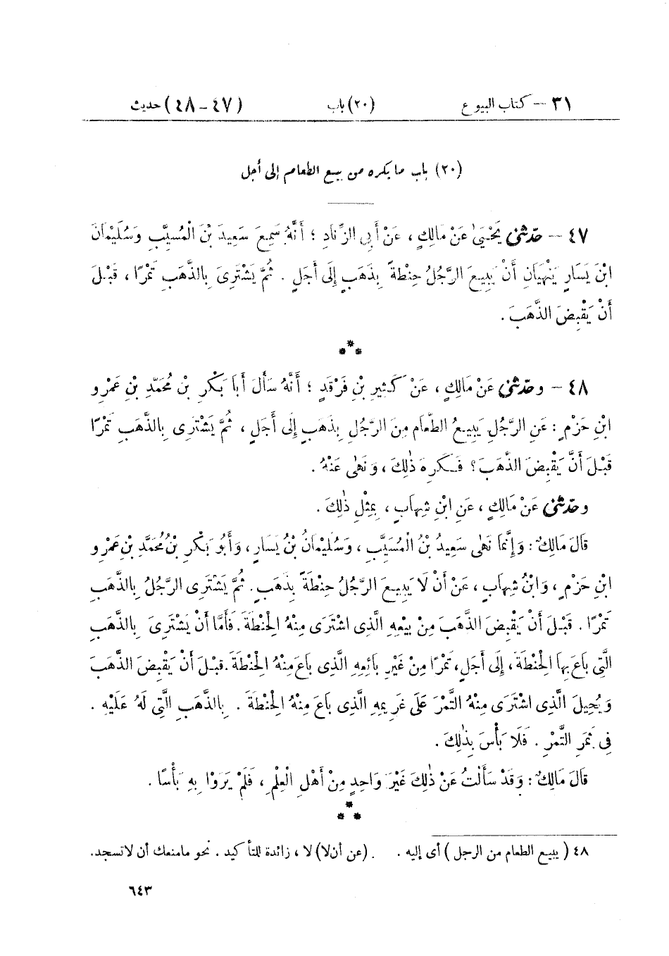 ٤٧ - حَدَّثَنِي يَحْيَى، عَنْ مَالِكٍ، عَنْ أَبِي الزِّنَادِ، أَنَّهُ سَمِعَ سَعِيدَ بْنَ الْمُسَيِّبِ، وَسُلَيْمَانَ بْنَ يَسَارٍ، «يَنْهَيَانِ أَنْ يَبِيعَ الرَّجُلُ حِنْطَةً بِذَهَبٍ إِلَى أَجَلٍ، ثُمَّ يَشْتَرِيَ بِالذَّهَبِ تَمْرًا قَبْلَ أَنْ يَقْبِضَ الذَّهَبَ»